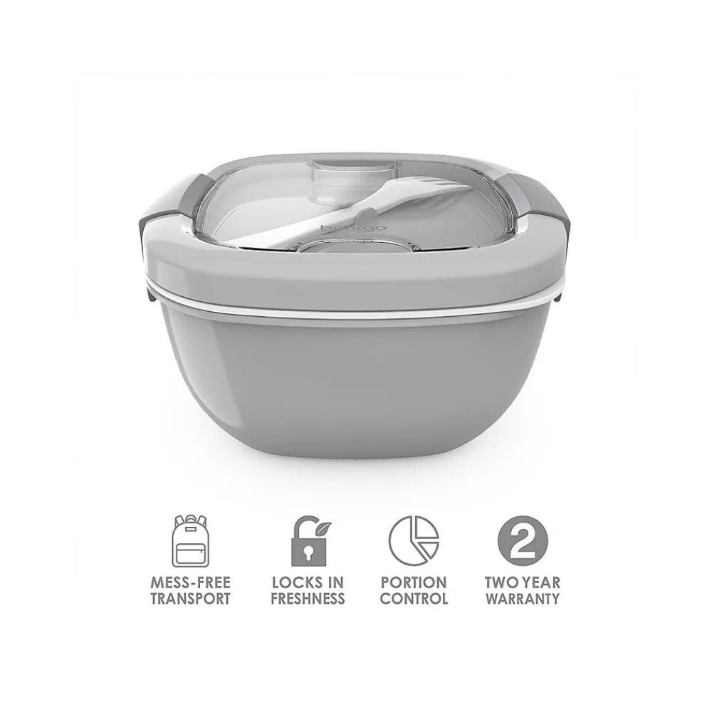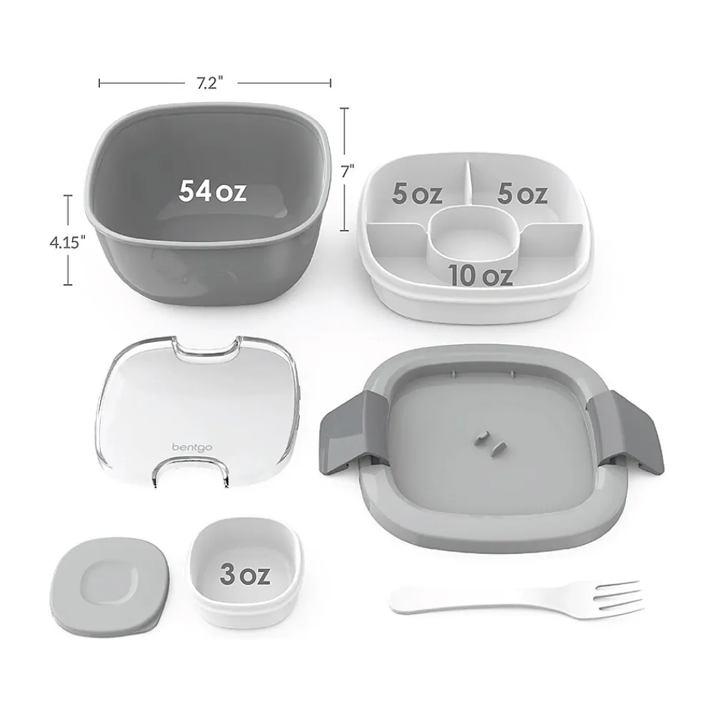 The bentgo Salad all-in-one salad container makes eating fresh and healthy salads while on the go easier than ever. The all-in-one design offers a perfect solution for mess-free transport of your greens, salad toppings, and salad dressing, so you can enjoy a delicious and nutritious salad at school, at work, on a plane, at the park, or just about anywhere. All the components of the bentgo Salad container stack conveniently inside the large salad bowl for easy portability.