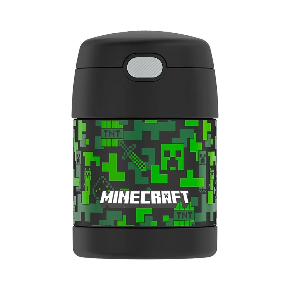 The Thermos FUNtainer 10 oz. food jar is the perfect lunch packing companion. The vacuum insulation and stainless steel construction contribute to maximum temperature retention and durability while ensuring freshness and safety of products within. The Thermos FUNtainer food jar keeps food hot for five hours and cold for seven. A folding spoon sits in the push-button lid compartment. Unscrew the entire lid to open the food compartment, which has a large opening, making it perfect to eat from as well making it easy to clean. This assortment offers navy blue, black or Minecraft food jars.