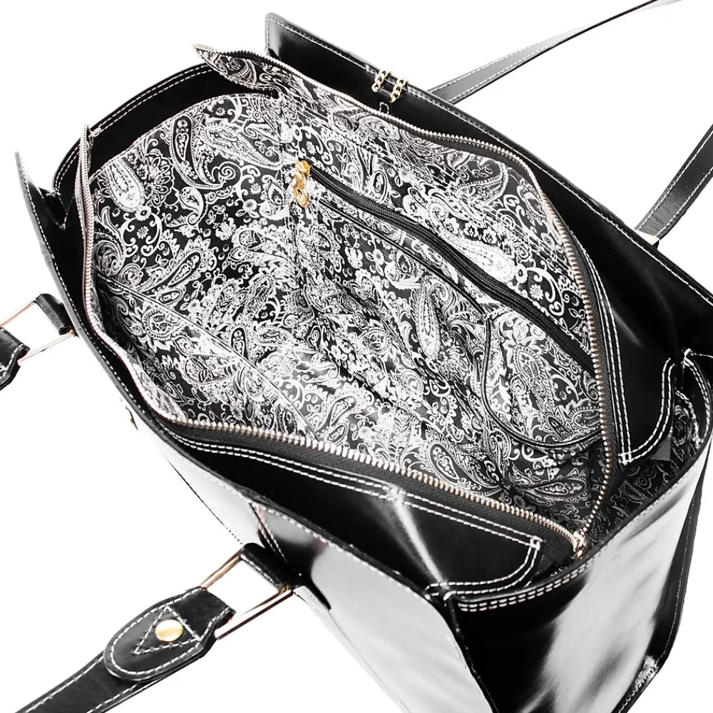- Tote features elegant Gold Key Chain. Easy Access Exterior back pocket. One pocket perfect for tablets. Secure zipper pocket. Two Leather reinforced accessory slip pockets.