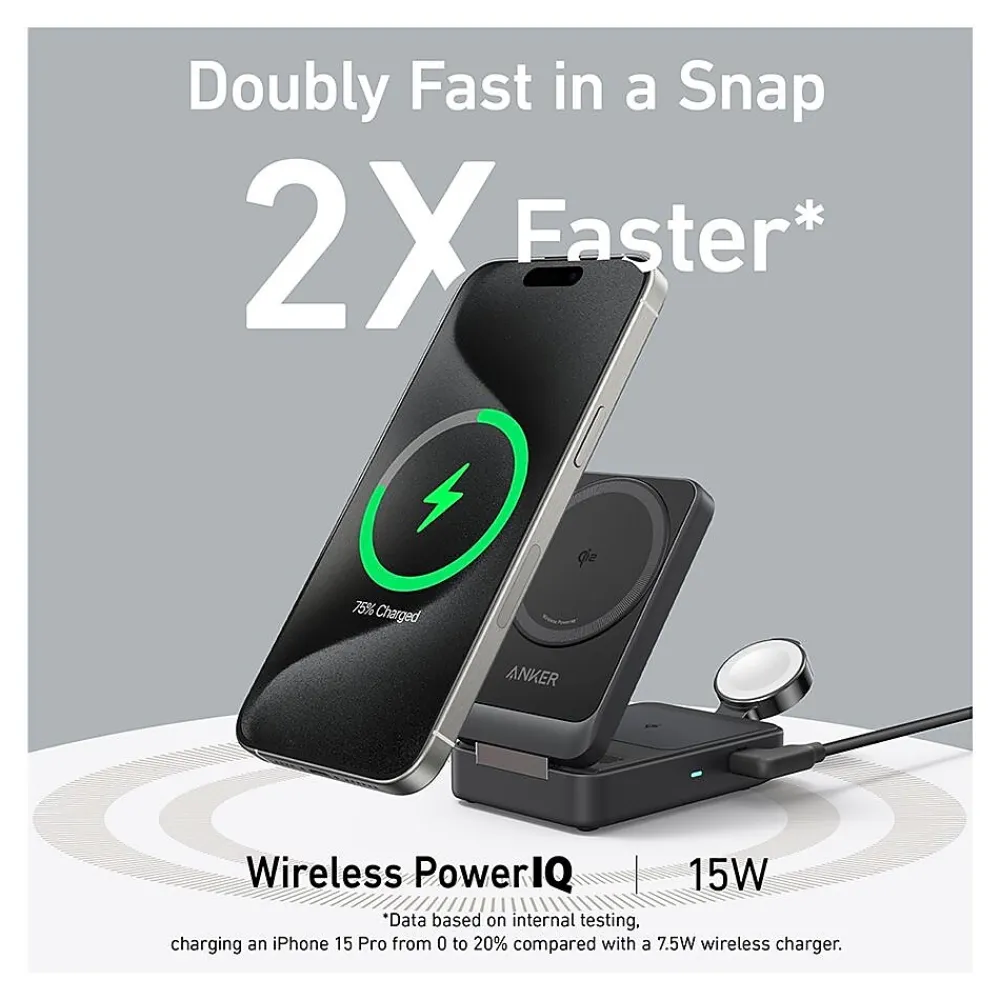 Introducing the latest in charging innovation, our Qi2 Certified Charging station delivers an unprecedented 15W of power for a lightning-fast and secure charging experience. Weighing only 6.9 oz and folding down to the size of a deck of cards, this ultra-compact design is a game-changer for those on the go. Time Keepers rejoice as our MFW certification ensures your Apple Watch Series 9 reaches 47% in just 30 minutes, surpassing non-certified chargers. With the 3-in-1 Apple Charger feature, simultaneously power up your iPhone, AirPods, and Apple Watch while enjoying the convenience of the built-in adjustable phone stand.
