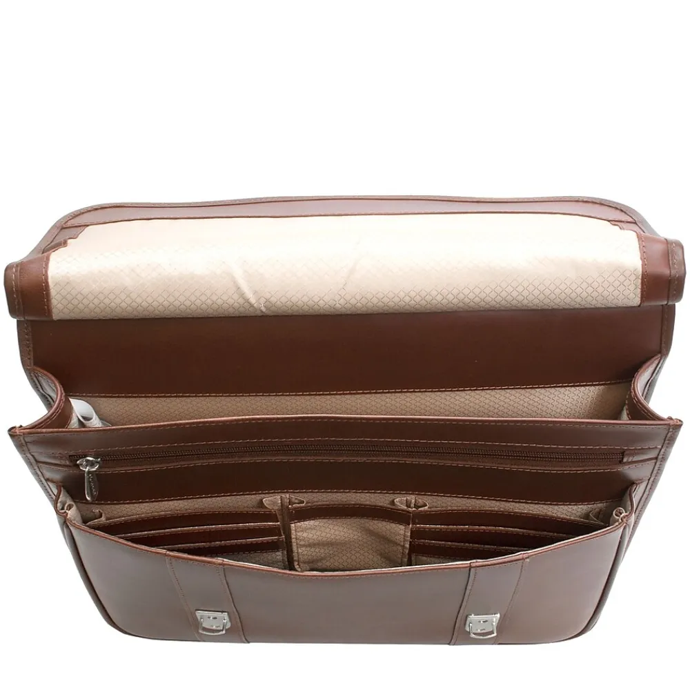 Flap-over, bar-top design briefcase with dual slip lock clasps.
