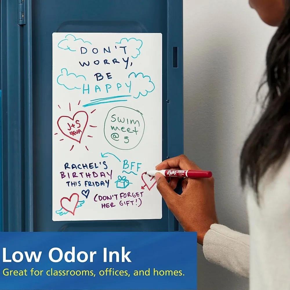 Write or draw on whiteboards or glass surfaces with these fine-tip dry-erase markers. The quick-drying, non-toxic ink is formulated to be low odor, making the markers ideal for regular use. Surfaces can be wiped clean with a dry cloth or eraser when lectures or presentations are done. Each pack of Expo low-odor dry-erase markers contains eight assorted colors for color-coding ideas.