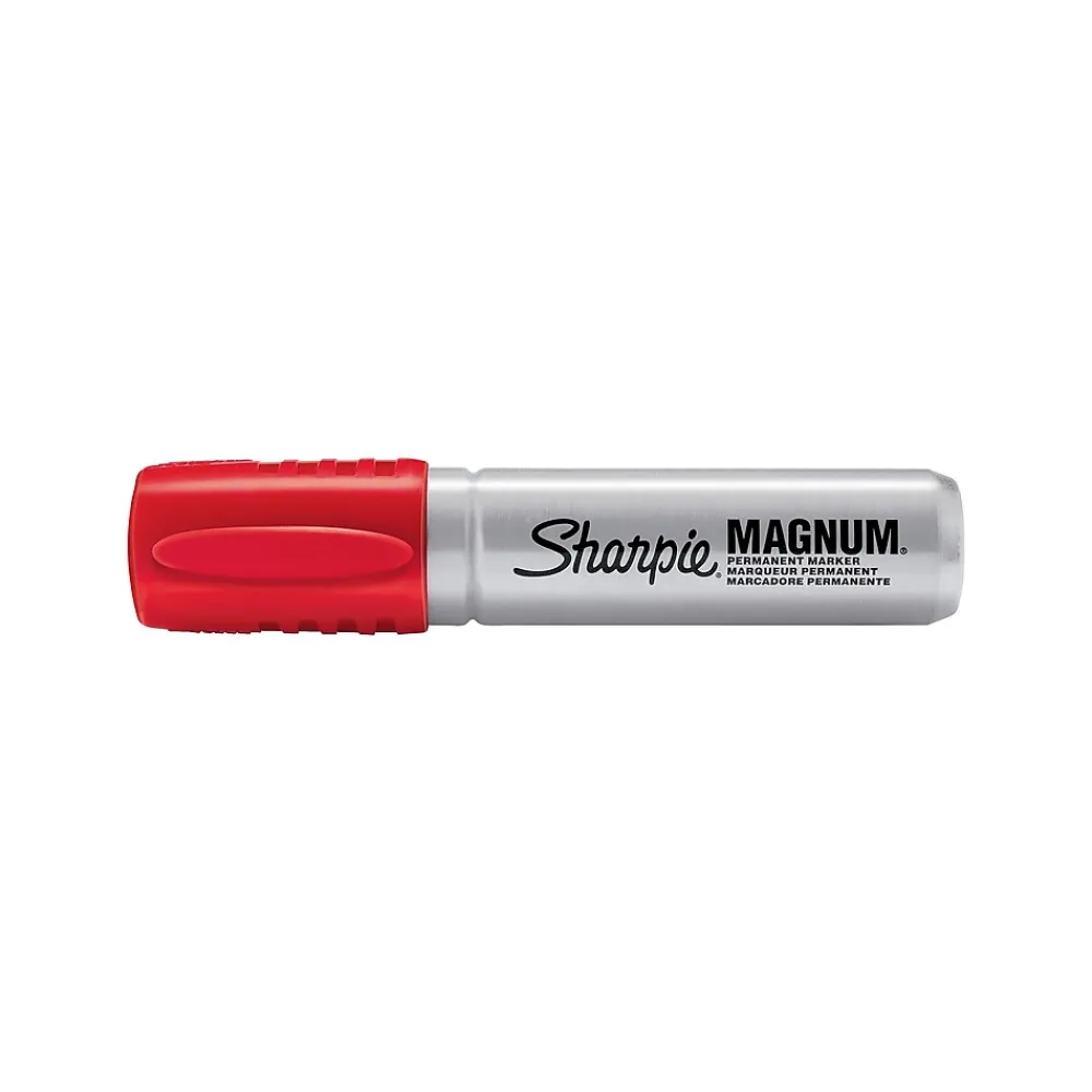Make permanent red marks with this Sharpie Magnum jumbo permanent marker. This marker has a chisel point, letting you create thin and thick lines without having to use a second marker, while the ink is AP-certified nontoxic and resists both fading and water. This Sharpie Magnum jumbo permanent marker creates highly visible lines on metal, plastic, wood and almost any other hard surface.