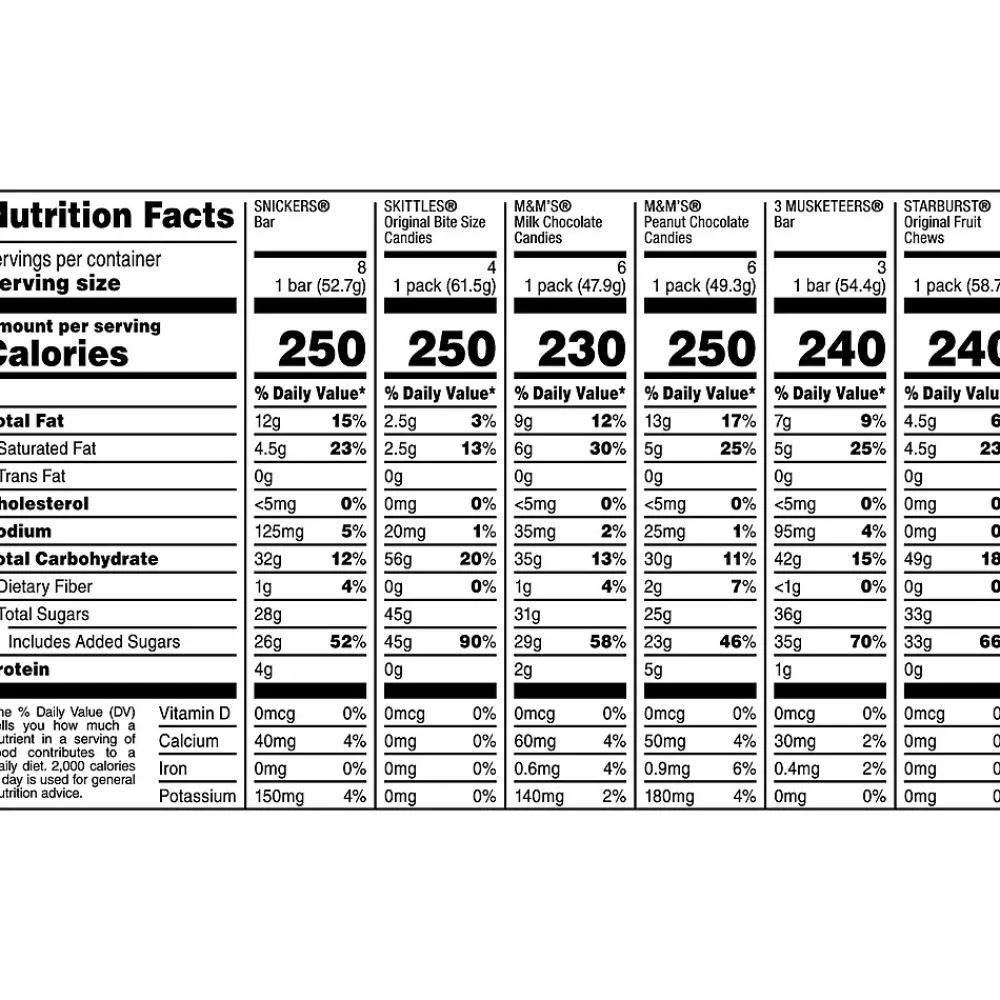| Type of Chocolate Actual manufacturer name for flavor | M&M’S, SNICKERS, TWIX & 3 MUSKETEERS |