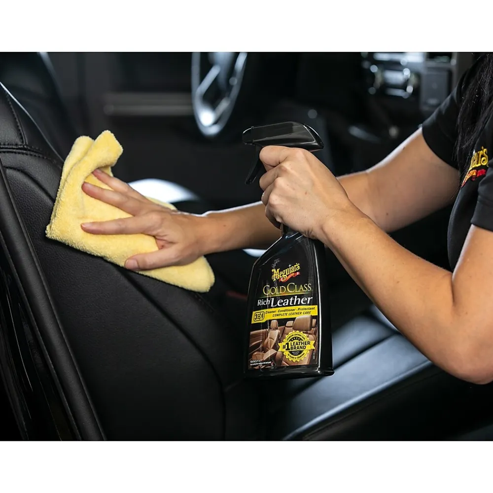 Use Meguiar’s Gold Class Rich Leather 3-in-1 formula for a simple but highly effective leather treatment that cleans, conditions and protects in one step. Our spray formula contains gentle cleaners that safely and effectively remove dirt and grime without leaving a white residue or greasy feel. Premium conditioners and aloe nourish leather for a supple look and feel, while UV protection helps to prevent aging, drying, cracking and fading. Gold Class Rich Leather 3-in-1 cleans, conditions and protects in one easy step for complete leather care.