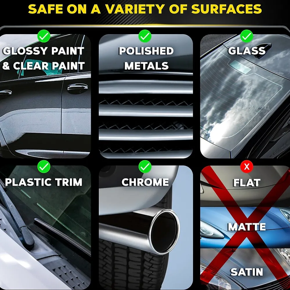 - SAFE FOR GLOSSY PAINTS: Is safe and effective on all glossy paints and clear coat finishes, glass, chrome, polished metals, and plastic trim