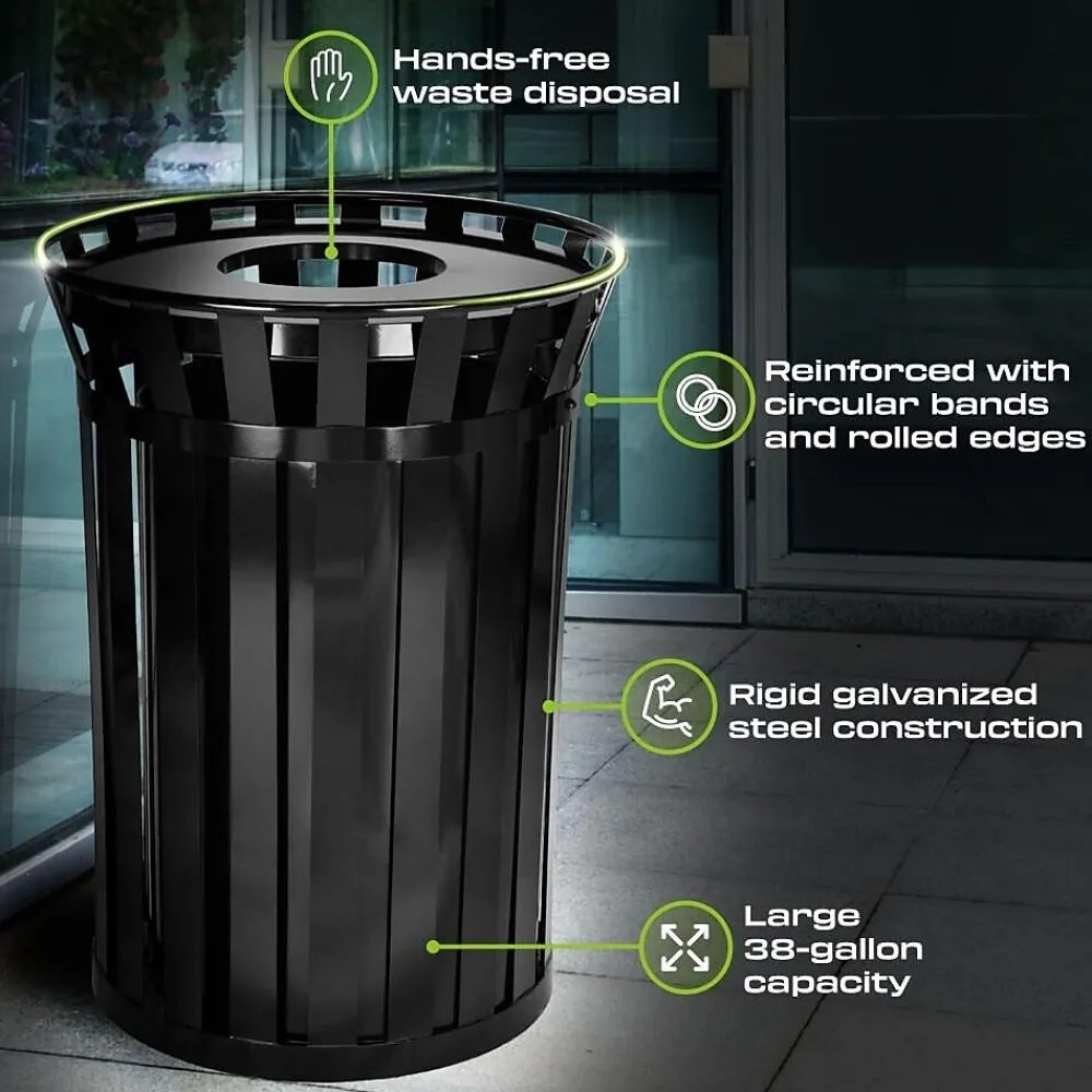 - Outdoor trash can with 38 gallon trash bag capacity endures extreme climate conditions