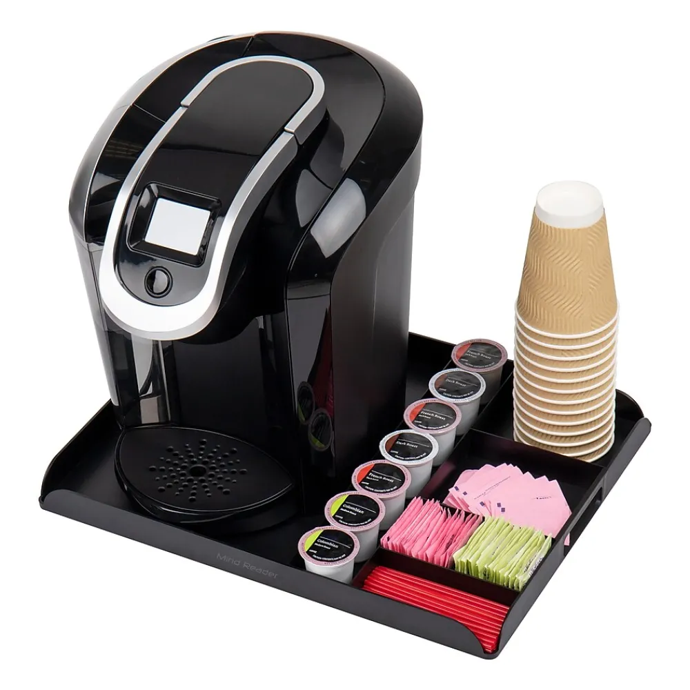 Transform your daily routine with this coffee station organizer that brings style and convenience to your coffee bar. Perfect for home use, offices, dorms, or vacation rentals, it neatly organizes coffee cups, pods, sweeteners, and creamers in one easy-to-reach place, making guests and coworkers feel welcome.Upgrade your work-from-home coffee bar or office break room with this handy organizer that’s not just for coffee lovers. Use it as a beverage machine base to store tea pods and hot chocolate packs, creating a cozy chai and cocoa station. The compact design of this coffee machine base is perfect for areas with limited space. If you don’t have a dedicated break room, simply place this beverage organizer on a large desk in your office or home office. College students can position it on top of a dorm mini-fridge for an all-in-one cold and hot beverage station.This coffee station makes an excellent gift for the ultimate hostess, office events coordinator, or a new college student. Treat yourself and conquer that coffee pod clutter in your kitchen with this stylish and functional organizer.