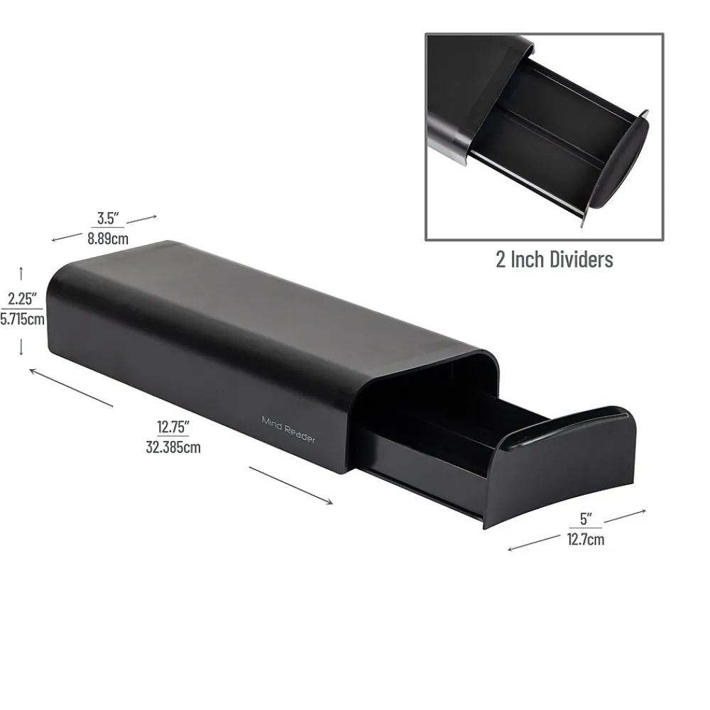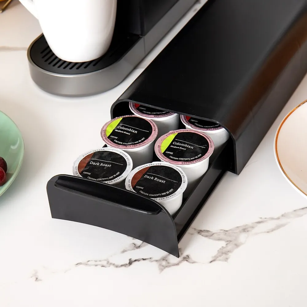 Start your day hassle-free with this sleek and slender single-serve capsule or pod countertop drawer. Made from durable black plastic, this compact organizer holds 12-14 capsules or pods and serves as a coffee machine base, maximizing your countertop space. The open interior allows you to store and organize various hot beverage options to suit any taste or mood, eliminating the need for multiple capsule boxes cluttering your counter.Maintaining this organizer is a breeze, as it can be quickly cleaned with a soft, damp cloth or paper towel. The lightweight design makes it perfect for taking on your travels, ensuring your favorite flavors are always close at hand. This attractive single-serve drawer makes an excellent gift for teachers, college students, or co-workers looking to streamline their morning coffee routine in style.