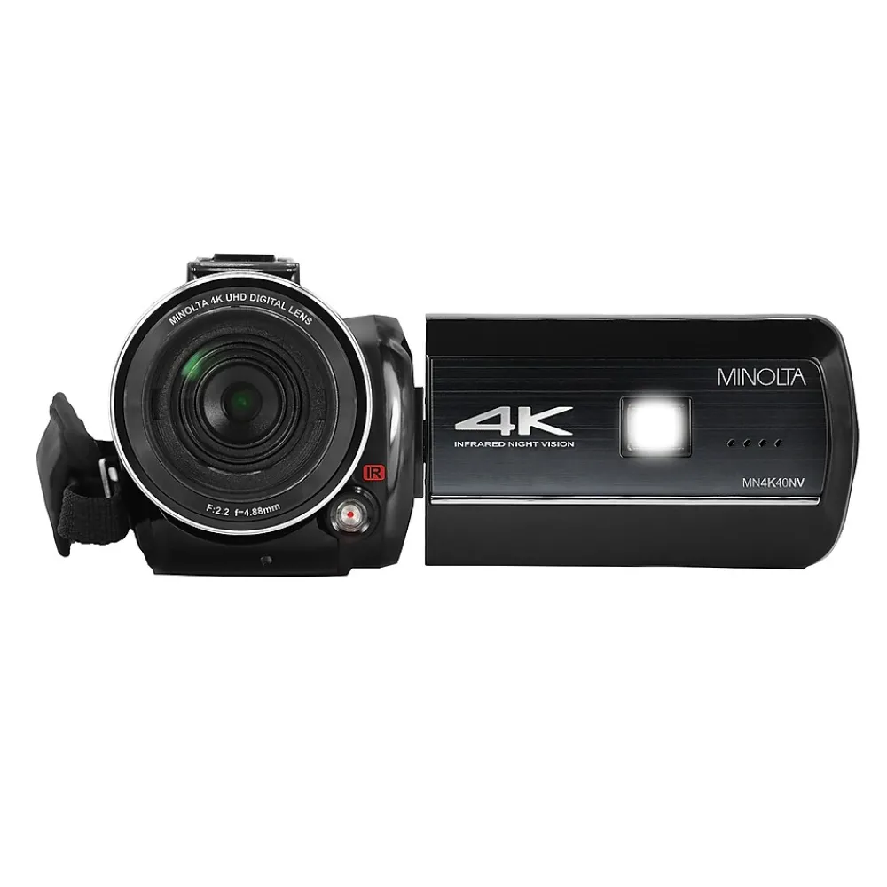 Minolta’s Black MN4K40NV Night Vision Camcorder records video content in 4K Ultra HD video and captures photos in 30 MP resolution. Loaded with features, it includes a 16x digital zoom, anti-shake stabilization, face detection, and a 3-in. high-resolution touch LCD. Its night vision capability uses an advanced infrared sensor that illuminates the scene in low-light conditions. You can easily add accessories with the integrated accessory-shoe mount. Included with the camera are an AC adapter, Li-Ion battery, remote, and 32 GB SD Card for hours of recording and hundreds of photos.