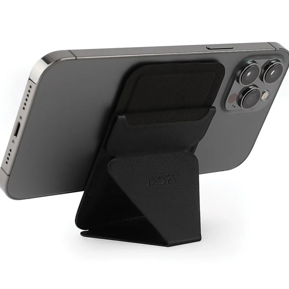 The MOFT Snap-on Phone Stand and Wallet for iPhone 12 and 13 Series in Night Black employs dual magnets to attach securely to iPhone 12 series and beyond. The fold-design allows for intuitive and flexible usage. Simply snap it on, stand it up, and fold it back into place. At 0.2 in. (5 mm), it’s extremely slim but has the ability to hold up to 3 cards for your everyday carry needs. This also allows you to securely hide and easily access your cards without the need to snap it off your phone. It features 3 viewing modes which enable you to look at your phone screen in the most comfortable way, whether you’re browsing the web in portrait, streaming in landscape or having a Zoom meeting in floating mode. Experience your iPhone hands-free from every corner of your home with MOFT’s wall sticker pads which can attach on any surface, like a wall or fridge, to transform your phone into an exercise, bath time, or cooking companion. It’s also wireless charger-friendly: just sandwich the wireless charger pad between the phone and stand for charging.