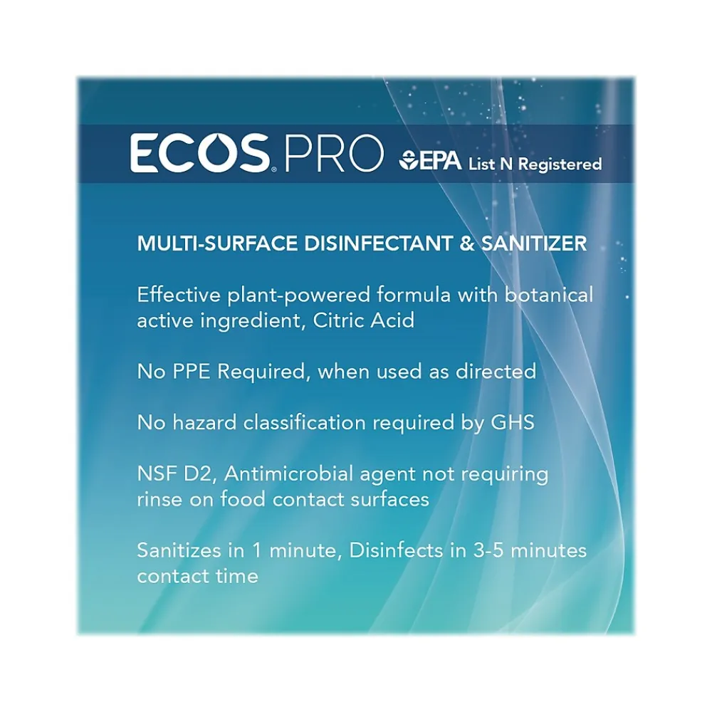 Effective against 99.9% of germs, the ECOS PRO multi-surface disinfectant and sanitizer cleans, disinfects, and deodorizes in one step. Its formula harnesses the power of botanical cleaning to disinfect hard nonporous surfaces. No rinsing is required when sanitizing food-contact surfaces (NSF D2) or children’s toys. It is dye-, bleach-, alcohol-, and phenol-free. Noncorrosive, nonirritating, and no harsh fumes for the user. Residue-free and streak-free. Safe for use around kids and pets when used as directed.