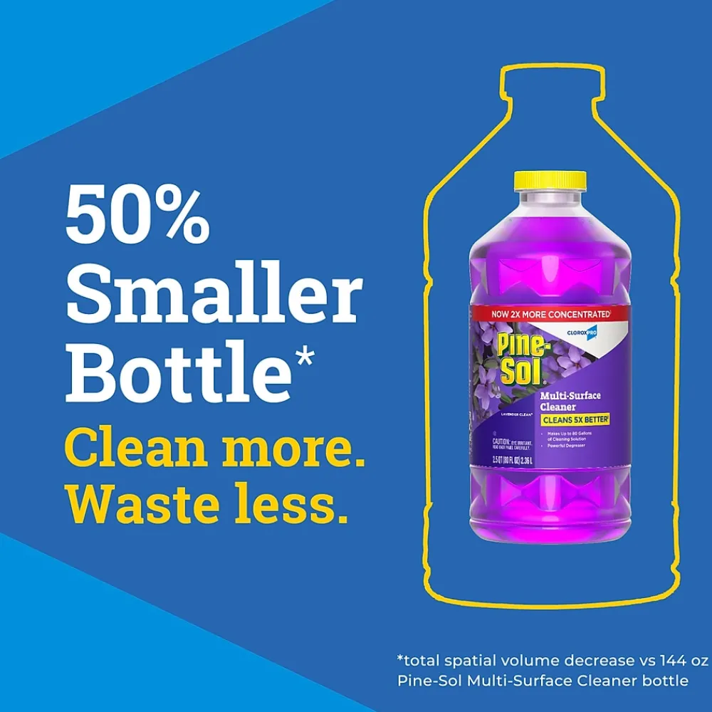 With Pine-Sol Multi-Surface Cleaner from CloroxPro, you only need one cleaner to fight tough dirt, grease and grime. This 2X concentrated formula delivers more cleaning power per drop and cleans 5X better than the previous Pine-Sol scented formula. Easier to handle and easier to store, the space saving bottle size gives you more cleaning solution in a smaller bottle made of 50% less plastic. This multipurpose cleaner cleans right the first time, removing stains and deodorizing soft surfaces while leaving a classic lavender clean scent. This powerful degreaser cuts through grime and soap scum fast and is safe for use on wood, tile, stone, porcelain, and glass and more when used as directed on hard nonporous surfaces. Do not use on marble, aluminum, copper or wood that is unfinished, unsealed, unpainted, waxed, oiled or worn. Vs. Original Pine-Sol Multi-Surface Cleaner. Vs previous Pine-Sol 144 ounce bottle