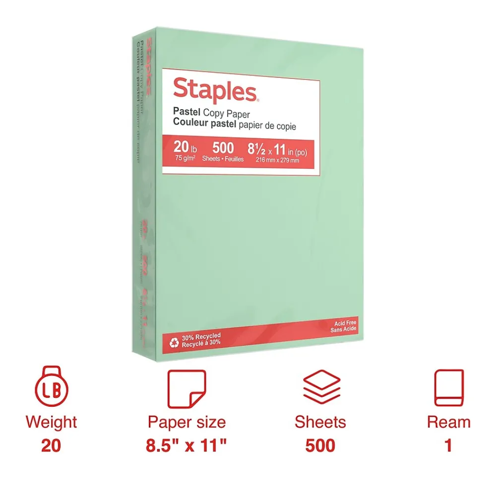 Print memos, notices and other projects on this pastel green copy paper. Each paper in this 500-sheet ream is acid-free and archival quality so your projects stand the test of time. This green paper is perfect for color-coding documents, adding emphasis to projects and creating notices that stand out. This Staples copy paper is compatible with most copiers and laser or inkjet printers.
