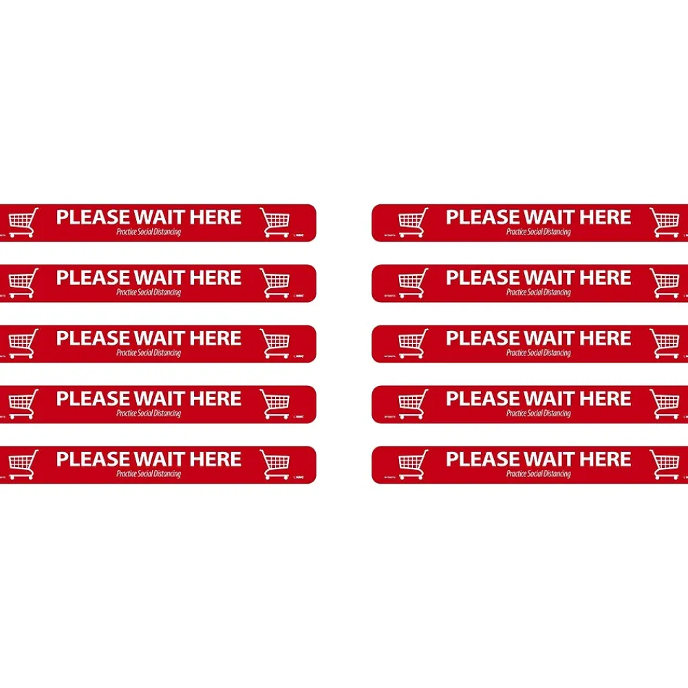 - Floor sign with “Please Wait Here. Practice Social Distancing” message imprinted in English