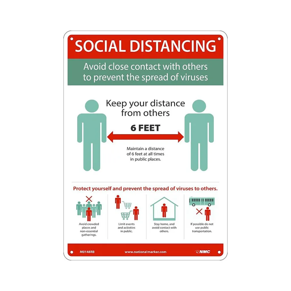 National Marker offers hundreds of pandemic-related identification products. Use this wall sign to remind employees and visitors to help mitigate the spread of harmful germs by taking the easiest of steps, such as keeping the distancing, avoiding the crowded places, limiting public events, and, if possible, staying home. This durable sign is made of rigid plastic and is perfect for long-lasting indoor or outdoor use. Signs are supplied with radius corners and predrilled mounting holes.