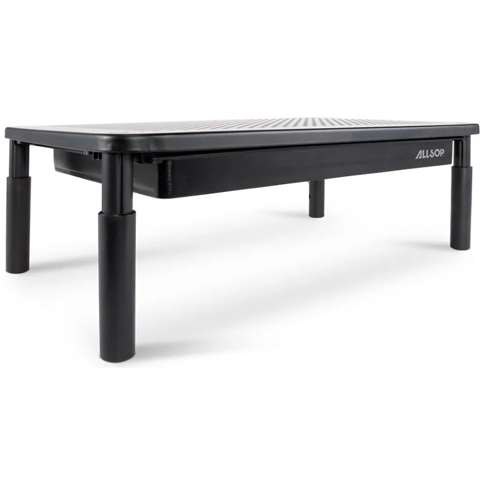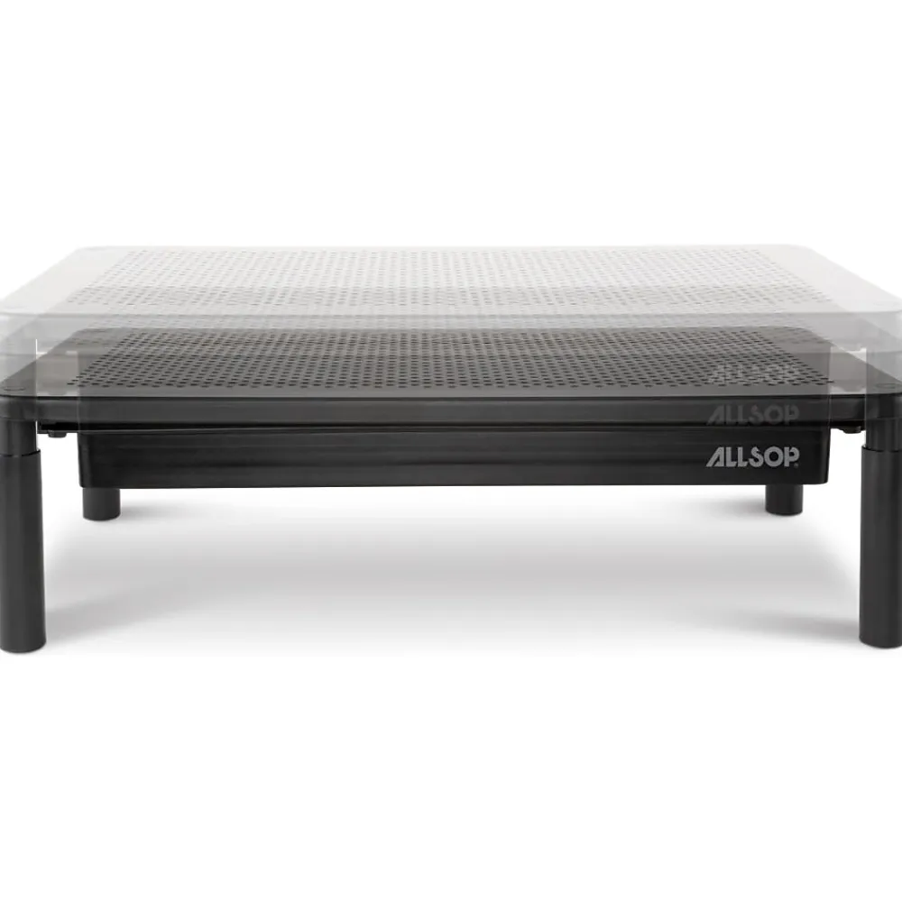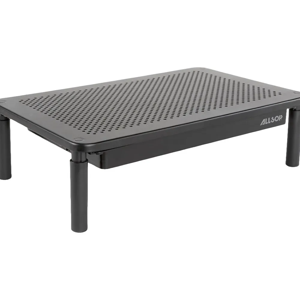 The Allsop metal art trilevel monitor stand features a durable powder-coated metal platform with microdot-perforated holes and supports monitors up to 35 lbs. and 27″. The telescoping legs allow users to choose from three height levels (4.13″, 5″, or 5.75″) for perfect ergonomic comfort. The integrated storage drawer is the perfect place for extra supplies and has a phone slot for easy access.