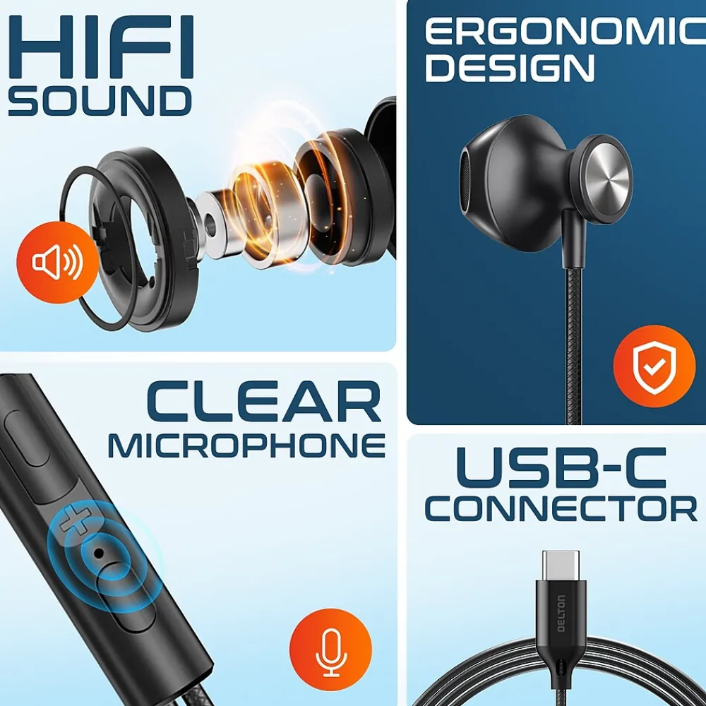 Discover seamless audio with the Delton 15EC wired USB Type-C earbuds designed for stable and uninterrupted connections. Adjust volume effortlessly with the in-line remote control and enjoy the ergonomic design that ensures comfort during extended use. The built-in noise-canceling microphone provides clear, hands-free communication, and the plug-and-use feature requires no setup. Control your music and calls instantly with the play/pause button, and enjoy crystal clear calls with the high-quality audio technology. The 10mm drive unit delivers powerful, dynamic sound with deep bass and clear treble, while the 4′ long-lasting cable offers flexibility and durability. Featuring USB Type-C connectivity, these wired earbuds with microphone are compatible with many modern devices, including smartphones, laptops, and tablets. The metal casing provides robust protection, and the comfortable, lightweight design and sleek, modern aesthetic make these computer earbuds perfect for any professional or personal audio needs.