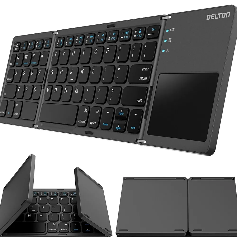 Transform your typing experience with the Delton F75 foldable Bluetooth keyboard, an ultimate tool for the on-the-go professional. This ergonomic keyboard folds down to a mere 6″ x 3.8″, easily sliding into your backpack. It’s equipped with Bluetooth for a rapid, stable connection and features a touch pad with full gesture support for effortless navigation. The long-lasting rechargeable battery provides up to 50 hours of continuous use, ensuring you stay productive throughout the longest work sessions. Designed with precision in mind, this portable keyboard offers quiet keys and a comfortable layout for accurate typing, and it is compatible with all your devices, including laptop/PC, tablets, and smartphones, across different operating systems, such as Windows, macOS, and iOS. This keyboard’s lightweight build doesn’t compromise durability, making it a reliable travel companion.