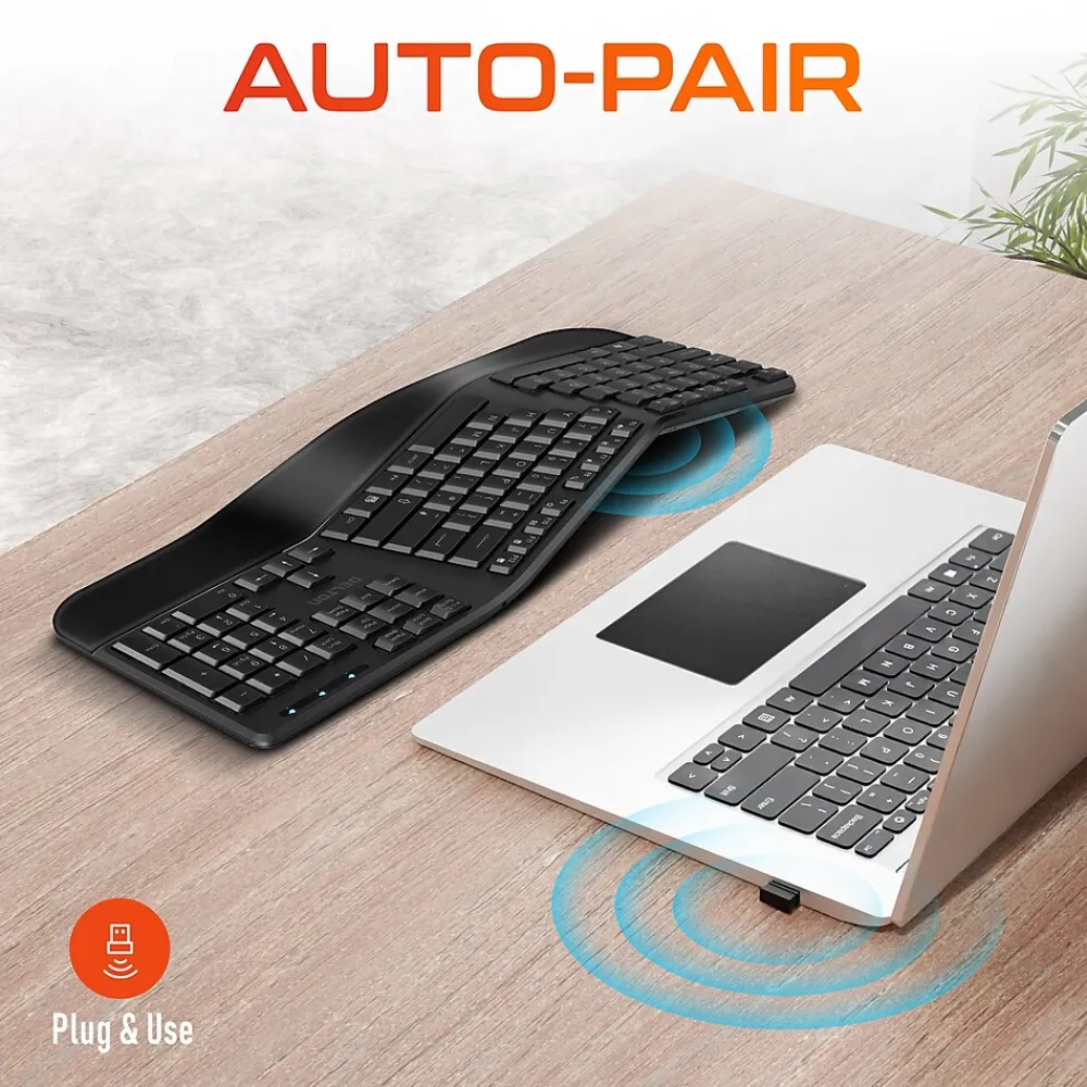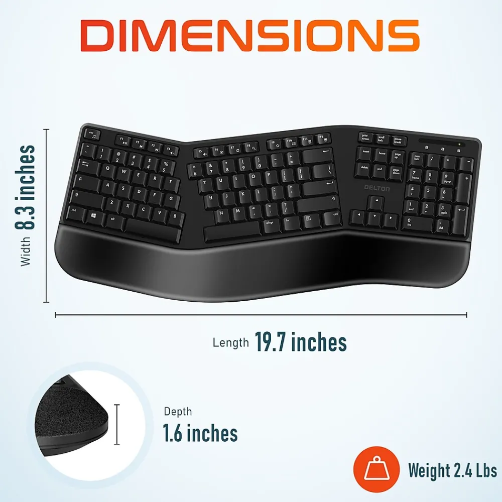 Embark on the path to eliminate pain with this science driven, curved, split keyframe ergonomic computer keyboard. The Delton KB200 wireless keyboard is designed for comfort and productivity. With a cushioned wrist support and a key layout that promotes a neutral and healthy posture for your hands, the KB200 ensures you enjoy the ultra-precise typing experience you expect with the added bonus of reduced fatigue and lower muscle stress. Make your daily computer use more comfortable.