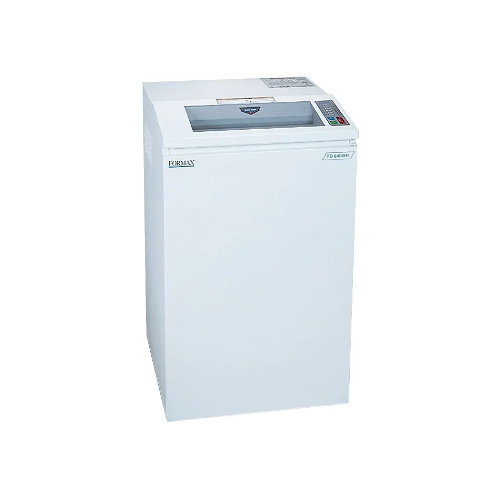 The Formax FD8400HS-1 high-security office shredder offers security with commercial-grade components in a sleek, practical design. An easy-to-use LED control panel puts the power right at your fingertips. The FD8400HS-1 shreds up to 8 sheets at once, up to 23 feet per minute, with a shred size of 1/32″ x 3/16″. The FD8400HS-1 meets the requirements of NSA/CSS Specification 02-01 for Level 6 (P-7) high-security crosscut shredders. The EvenFlow automatic oiling system is standard on the FD8400HS-1, and periodically lubricates the cutting blades based on motor runtime, keeping the shredder in peak operating condition. In addition, the Eco mode saves energy by automatically switching into standby mode after 5 minutes of inactivity. Commercial-grade features include heat-treated steel blades, a steel cabinet, lifetime-guaranteed waste bin, and a powerful AC geared motor ensuring years of reliable performance and information security.