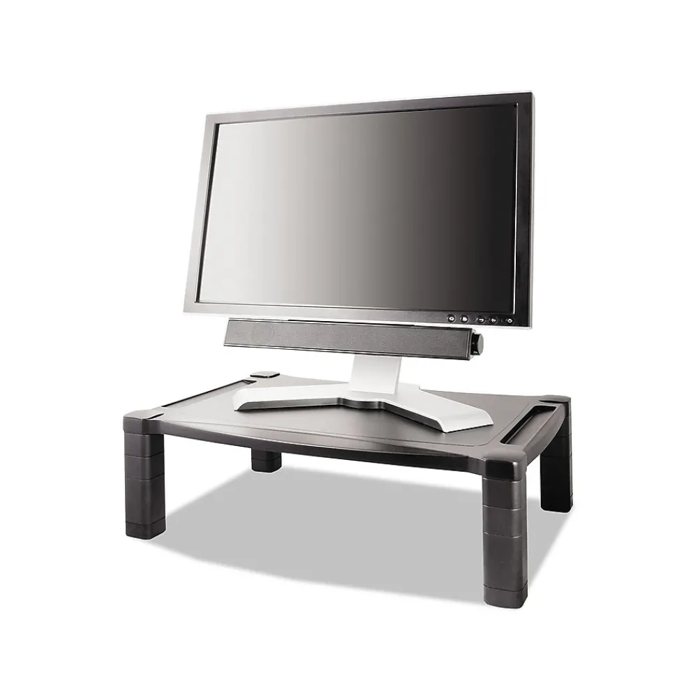Improve the viewing angle of most monitors with this adjustable stand. The wide base also supports heavier devices including printers and fax machines, and additional storage area underneath the base improves overall desktop organization. Additional fixtures on this Kantek stand help manage video connections or cables that power the monitor and a variety of other devices.