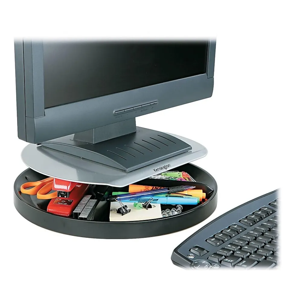 - The patented, spinning multi-compartment storage area underneath the platform provides easy access to your most-used desktop tools and accessories