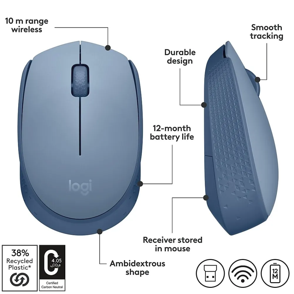 Now is wireless. With Logitech M170 Wireless Mouse, choose the reliability of a cord with the convenience of wireless – and a 10-metre (33-foot) range – thanks to Logitech Advanced 2.4 GHz wireless technology. This affordable mouse works for many months on a single AA battery. Set up is simple – just plug the tiny wireless receiver into a USB slot. There’s no hassle with pairing or software installation, and M170 is compatible with Windows, Mac and Chrome.