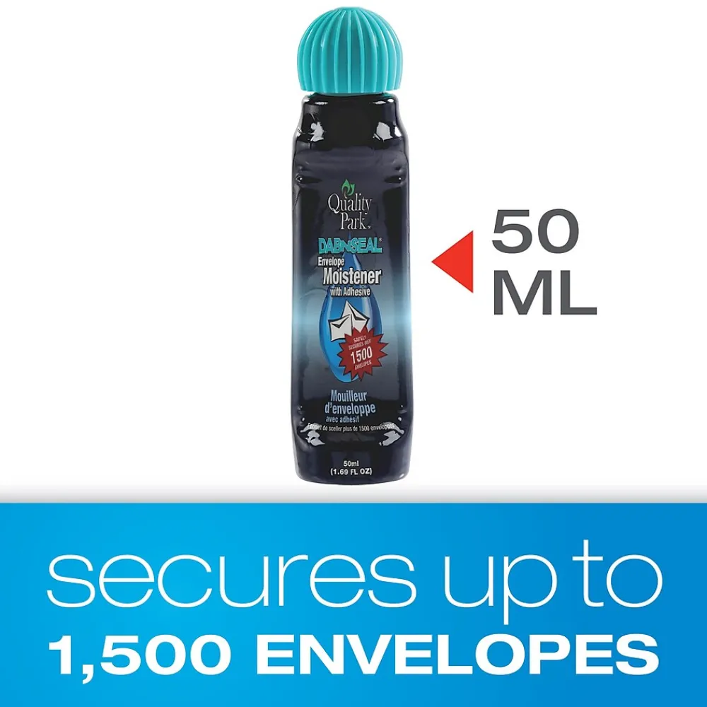 One 1.69 oz. bottle of Quality Park Dab-N-Seal envelope moistener with adhesive seals over 1500 envelopes. Never lick envelopes again with this spillproof, no-clog, nontoxic product. It is great for any paper project.