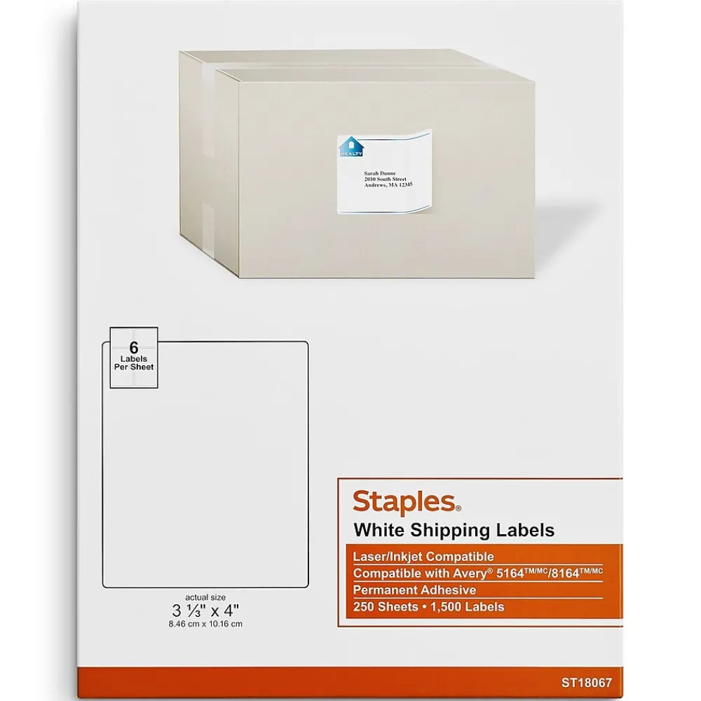 Make shipments look professional with these Staples shipping labels. These labels are matte white, helping text and images to stand out, while their permanent adhesive ensures that they stay wherever you place them. These Staples shipping labels can be custom designed by using any common word processing software, such as Corel WordPerfect or Microsoft Word.