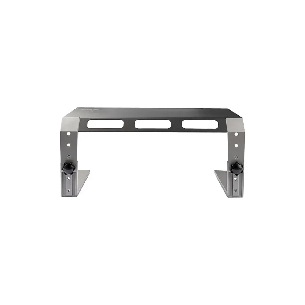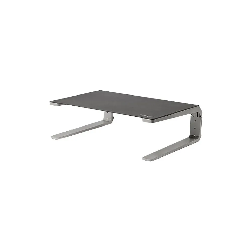 Create a more ergonomic workspace. This strong and sturdy monitor riser stand lifts your display off of your desk for more comfortable viewing, helping to prevent neck strain. Its attractive silver and black design adds to the aesthetic appeal of your workspace, and creates storage space underneath. Elevate your display to position your monitor. You can customize the height of the computer monitor riser, adjusting easily to three different heights: 4.9″, 5.9″ or 6.9″ (12.5, 15 or 17.5 cm) off the desk surface. With a robust 10.5″ x 16″ steel surface area and an aluminum base, the monitor riser provides a stable platform for a monitor up to 32″ with maximum weight capacity of up to 22 lb. (10 kg). You can also use it for your laptop. The non-skid bottom surface of the feet provides a solid grip while protecting your desk surface from scratches and scuff-marks. It’s ideal for a variety of desk surfaces including glass-top desks. Maximize your work space and create a clutter-free area. Store your mouse, phone, and other items underneath the monitor shelf so they are out of view, but not out of reach. You can also use the riser stand to raise your printer, freeing up desk or counter space underneath. The integrated cable management slots keep cables organized and out of view. With fast and easy setup, you’ll be ready to work with the monitor riser within minutes.