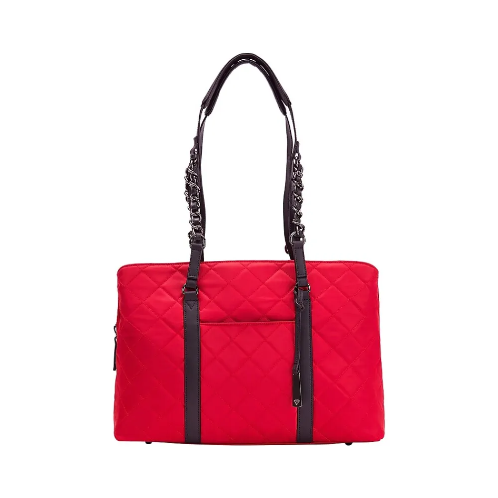 - Stylish laptop tote made of red quilted nylon with black lining and black vegan leather trim; completed with polished hardware in gunmetal color