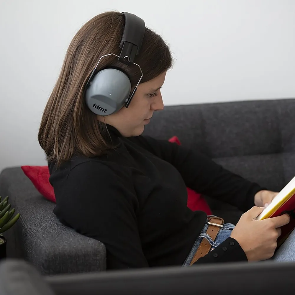 FDMT protective earmuffs are used to protect hearing and reduce noise distractions in a noisy environment. They attenuate loud and harmful noise, without excluding other ambient sounds. The sound level is considerably reduced to promote sustained attention and concentration. The stretchable headband and the pivoting, cushioned ear cups allow a head adjustment for both children and adults. Comfortable, robust and foldable, they fit into the included pouch for hygienic storage and convenient transport.