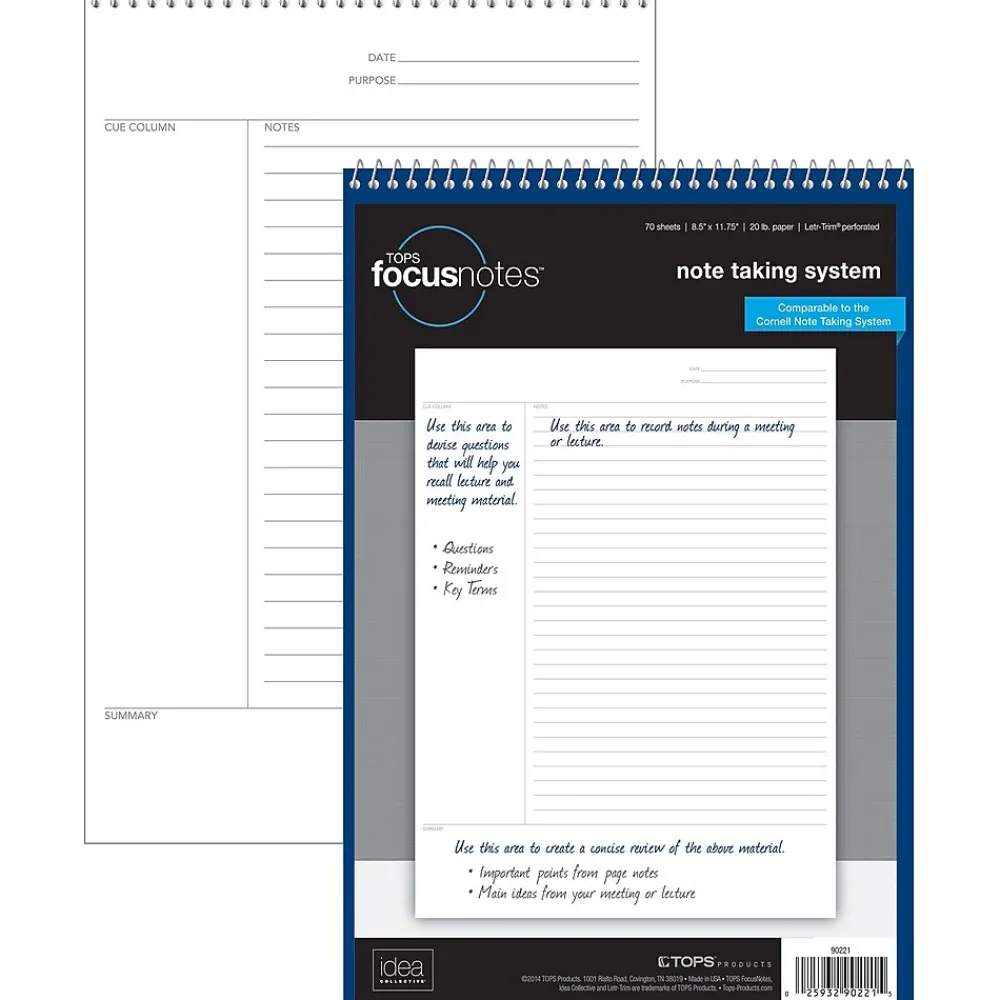 Use the note-taking section to record main ideas and facts, the cue column to write questions and key concepts, and the summary section to list the major themes of each page. The result is a detailed record ideal for study and review. Top-wire bound on a sturdy, no-snag coil. Perforated sheets. Proudly made in the USA. 8.5″ x 11.75″. 70 Sheets.