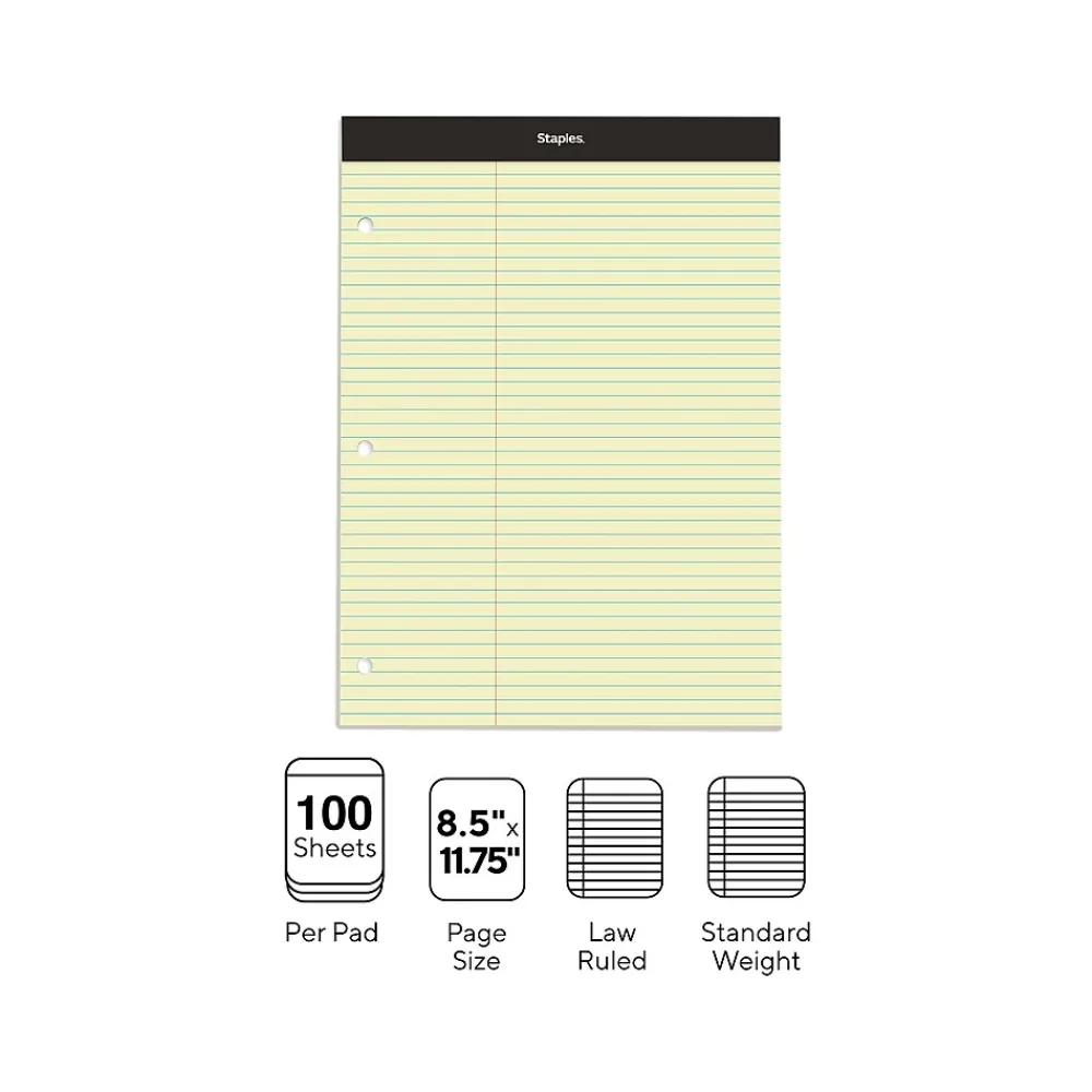 Furnish your work desk with this canary 100-sheet law ruled notepad. Convenient perforations let you cleanly peel off a page, while the law-ruled pages let you easily include notations and points of order in the wide margins. This Staples 8.5 x 11.75-inch canary law ruled notepad features top binding so you can flip through the pages and find information quickly.