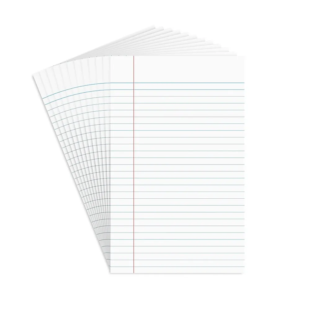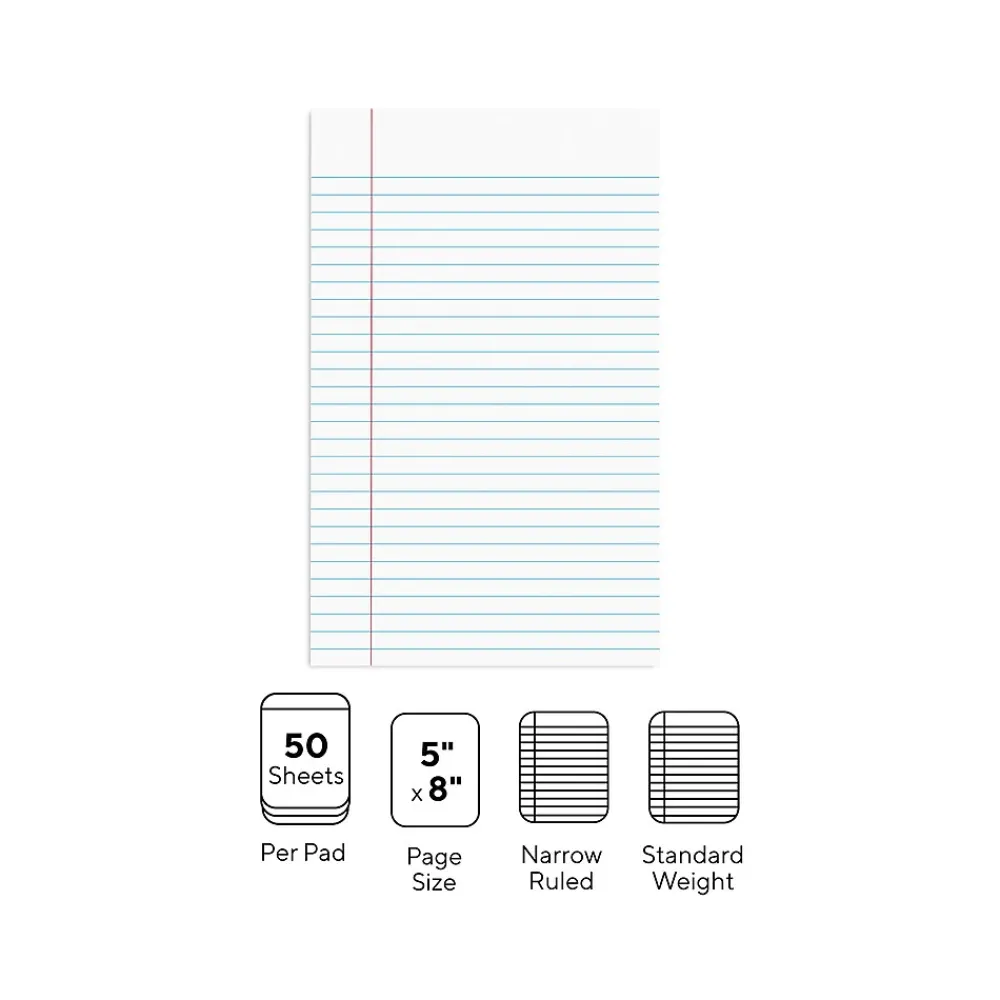 Provide your office with a reliable supply of these white 50-sheet notepads. The narrow ruling lets you write more lines of text, while the white pages are a great backdrop for legible notes. The glue-top binding makes it easy to flip through sheets. These Staples 5 x 8-inch white narrow ruled notepads are a perfect size for taking to meetings and lectures.