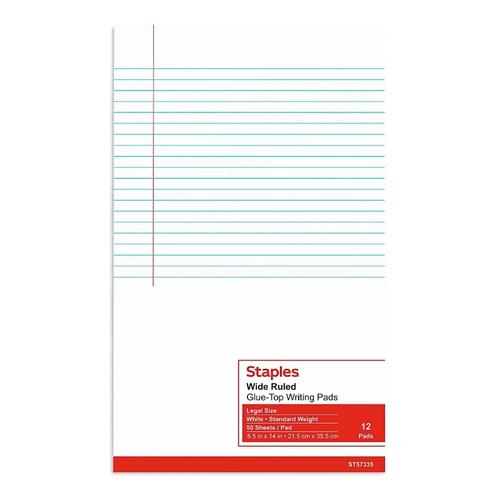 Equip your office with a convenient supply of these white wide ruled notepads. The glue-top binding lets you easily leaf through the sheets, and the wide-ruled pages ensure your text remains neat and legible. These Staples 8.5 x 14-inch white glue-top notepads have 50 sheets per pad to provide enough pages for your drafts.