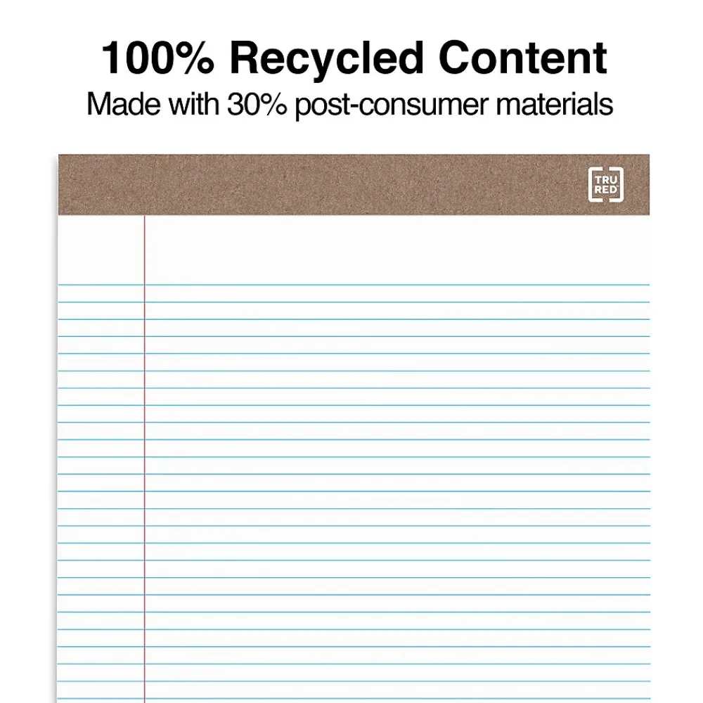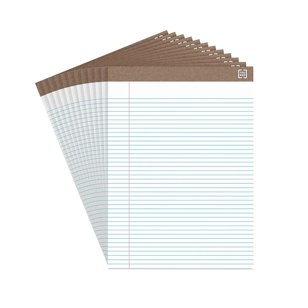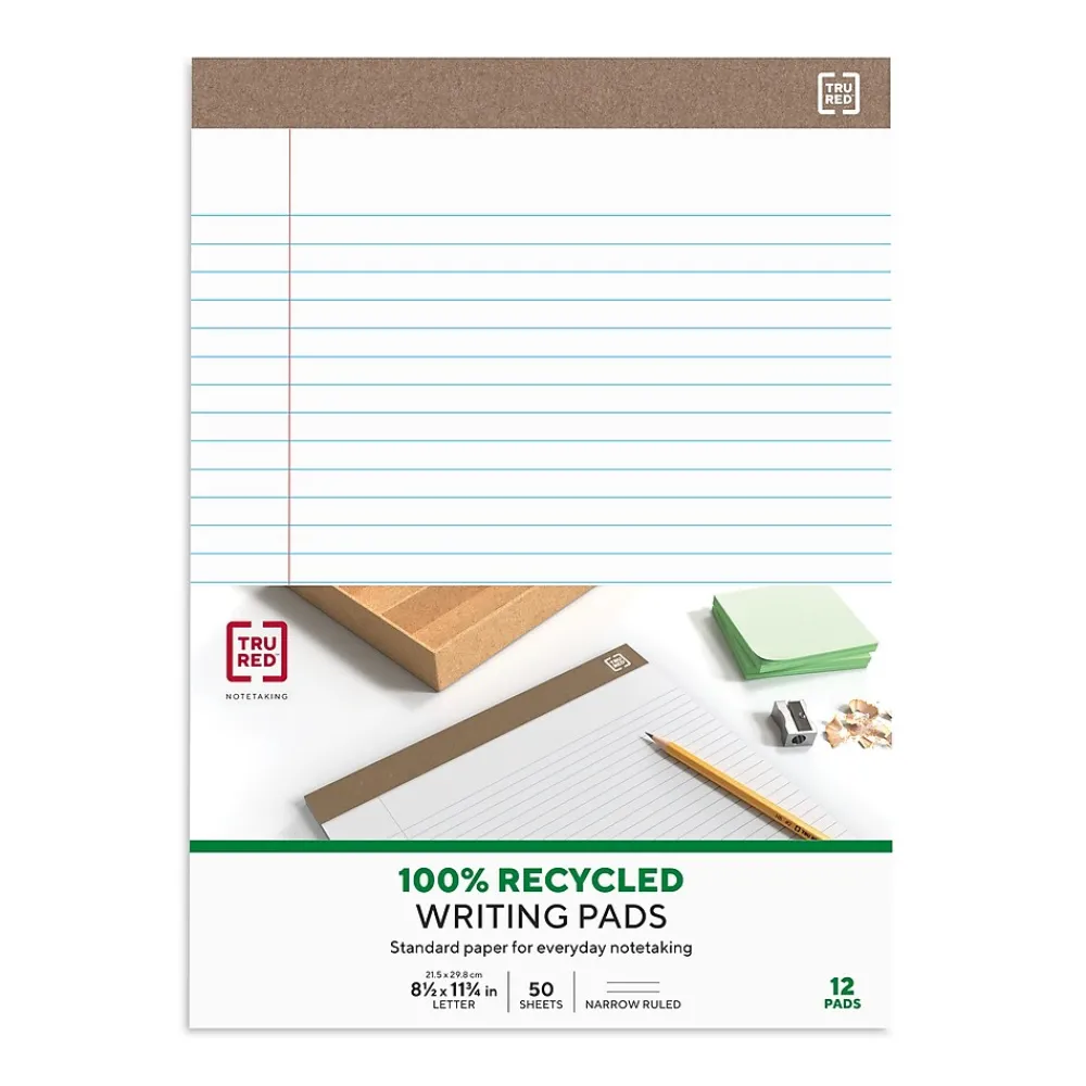 Record your thoughts, plans, and ideas on this 50-sheet ruled notepad. Narrow ruling on each page lets you write more to save space, while the top-bound construction makes it simple to flip through pages. The useful perforations allow effortless sheet removal. This TRU RED™ 8.5 x 11.75-inch white narrow ruled notepad comes in a pack of 12 for classroom or conference use.