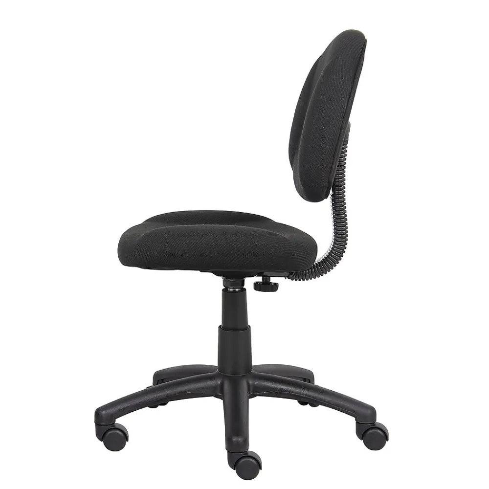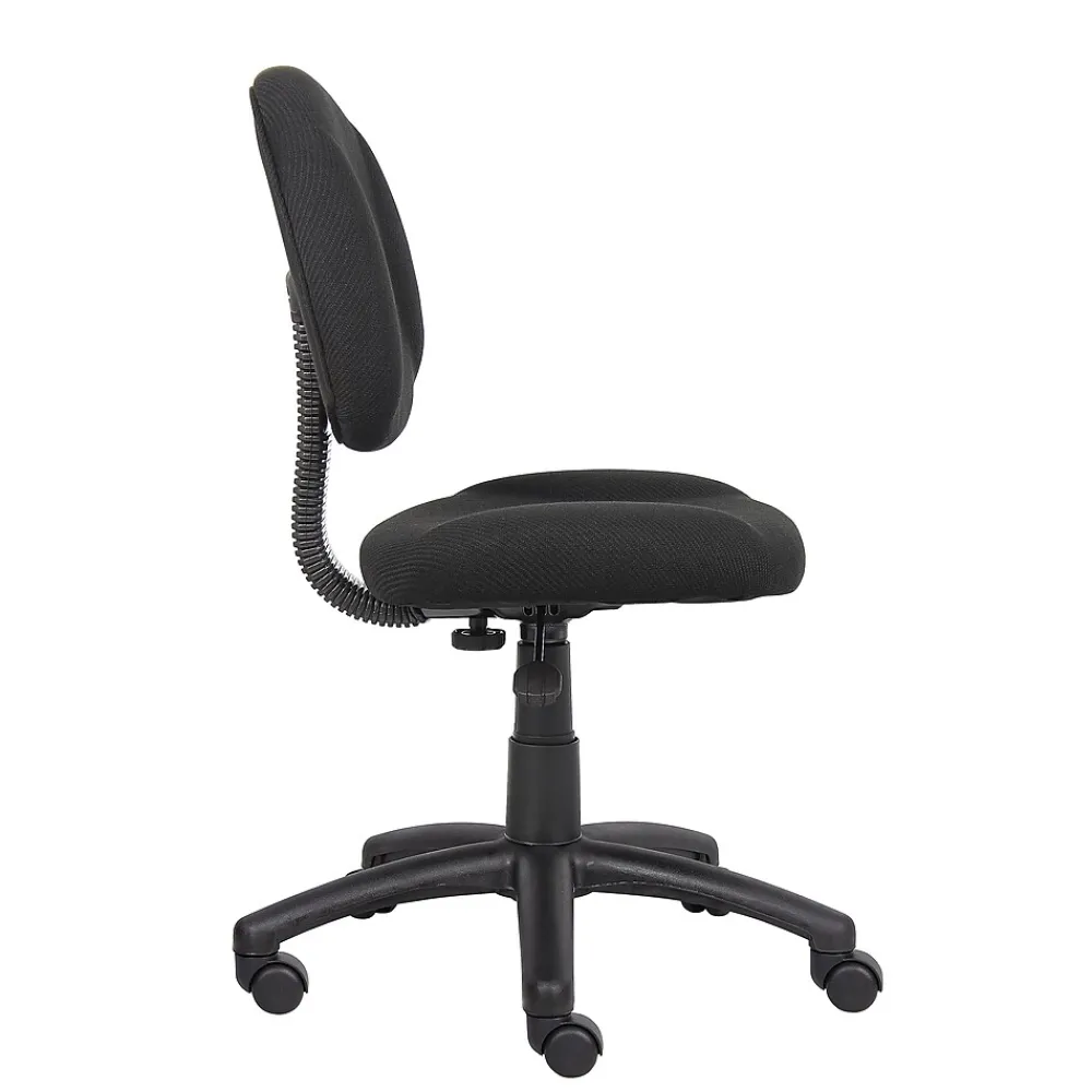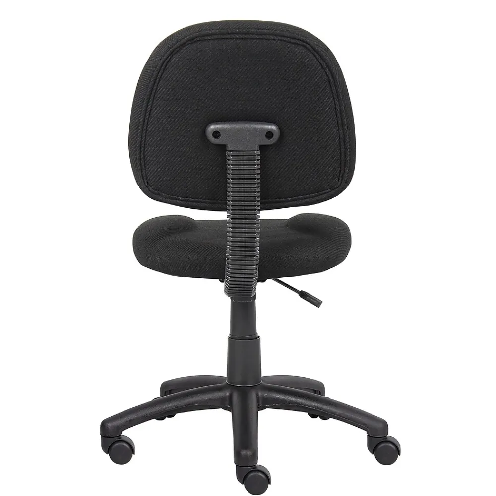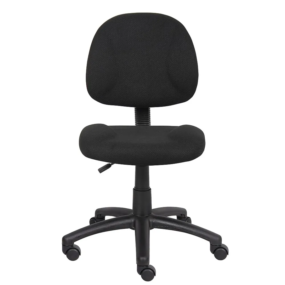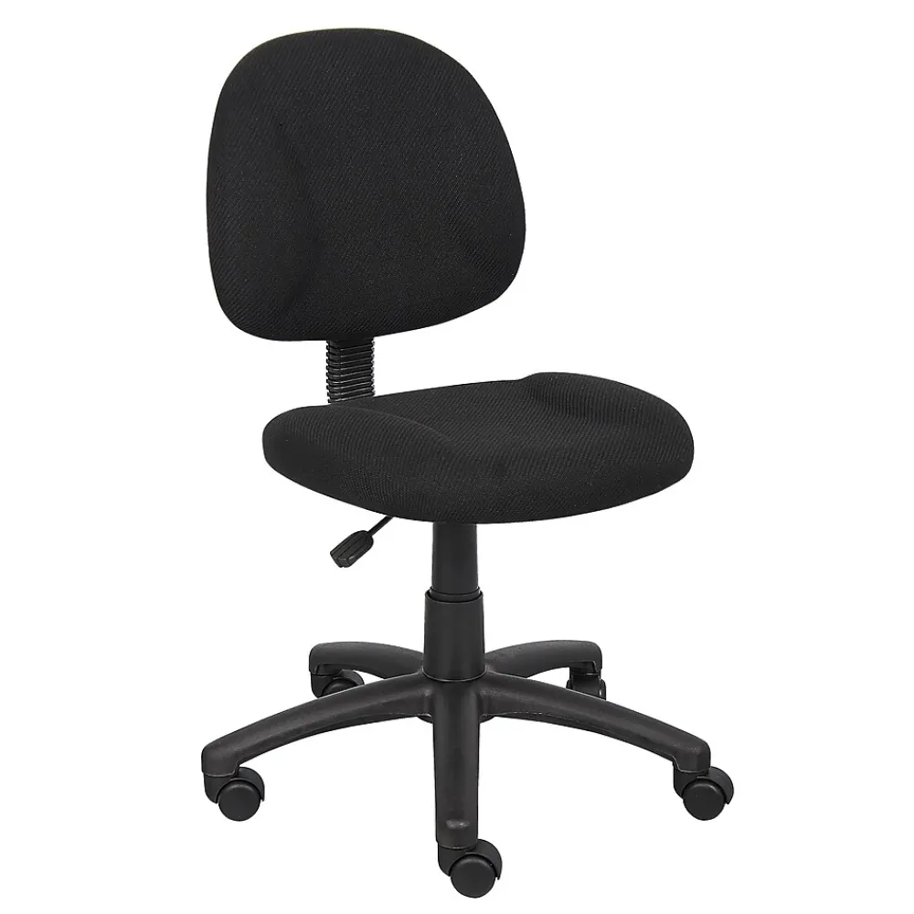 Provide a more comfortable seating experience for your staff with this Boss Perfect Posture office chair. Contoured, padded cushions offer softness plus support for all-day comfort, while the durable tweed upholstery stands up to frequent wear and tear. A five-star base and rolling casters make moving this chair from room to room simple. Adjust the seat height up or down to match your desk setup and use the swivel seat to transition from your computer to your filing cabinet or credenza. With its simple silhouette and neutral black color, this Boss Perfect Posture office chair brings understated style to your workplace.