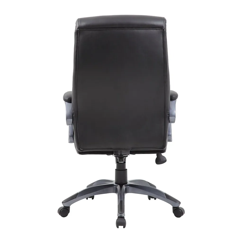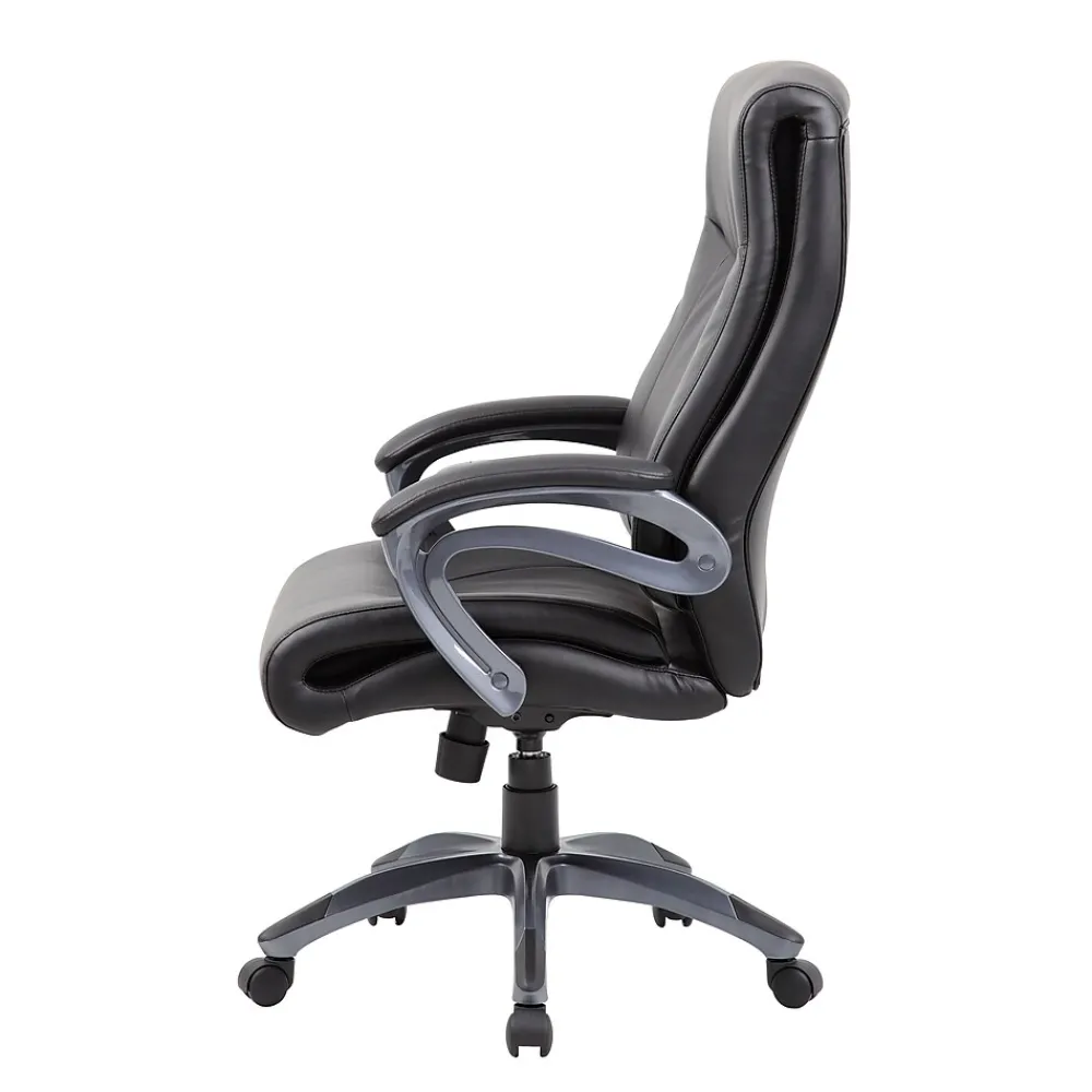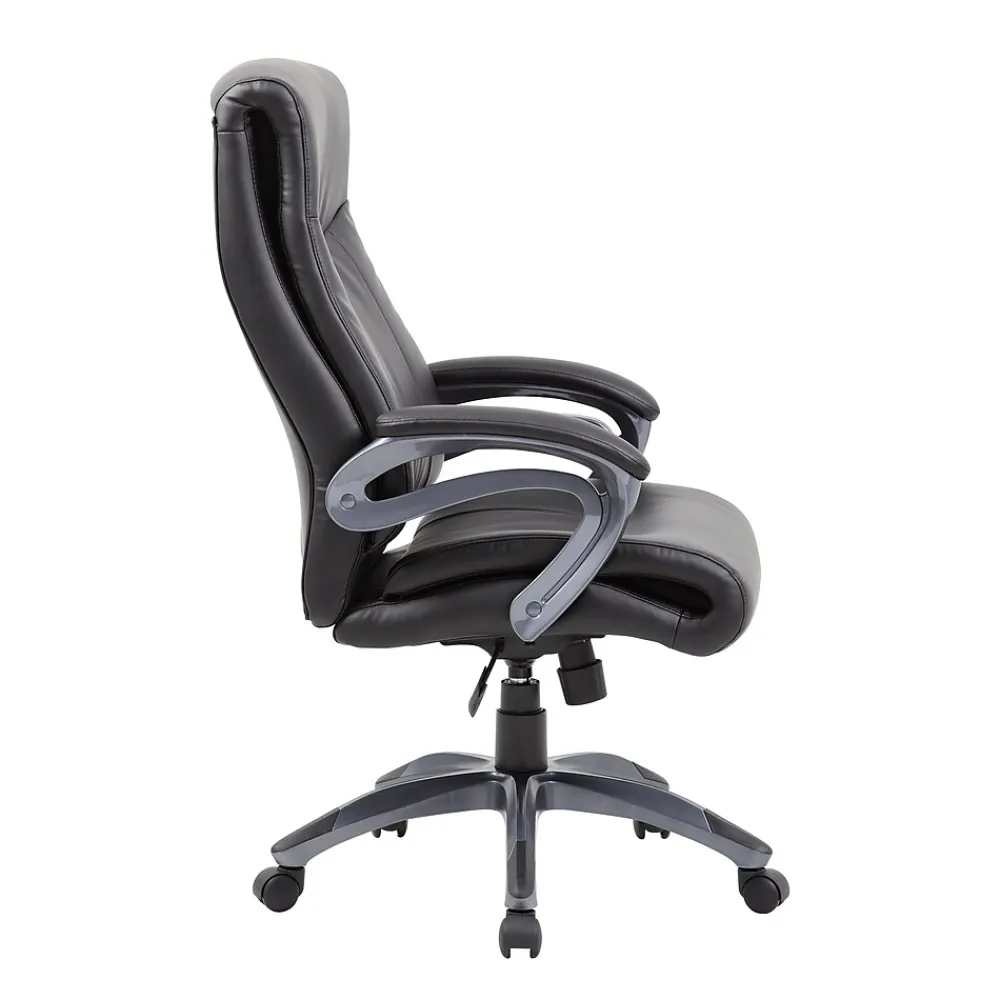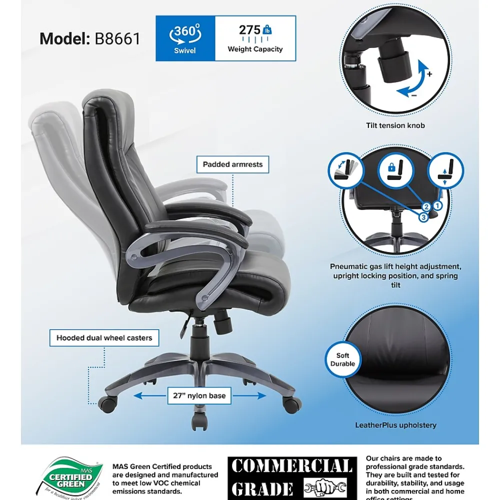 When it comes to comfort, our double layer executive chair will make sure you never settle for second best. It is elegantly upholstered in black Leather Plus, a comfortable combination of leather and polyurethane that provides softness and durability. In addition to its padded armrests and gun metal finish, it features pneumatic gas lift seat height adjustment and adjustable tilt tension control. All of this rests atop a large 27” nylon base with five hooded double wheel casters.