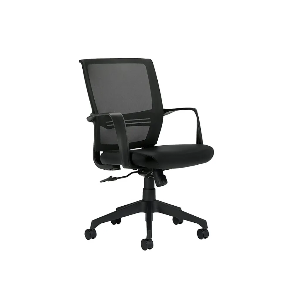 The Offices to go conference chair features a mesh back with Luxhide seat. The pneumatic seat provides height adjustment. Single-position tilt lock provides tilt tension adjustment.