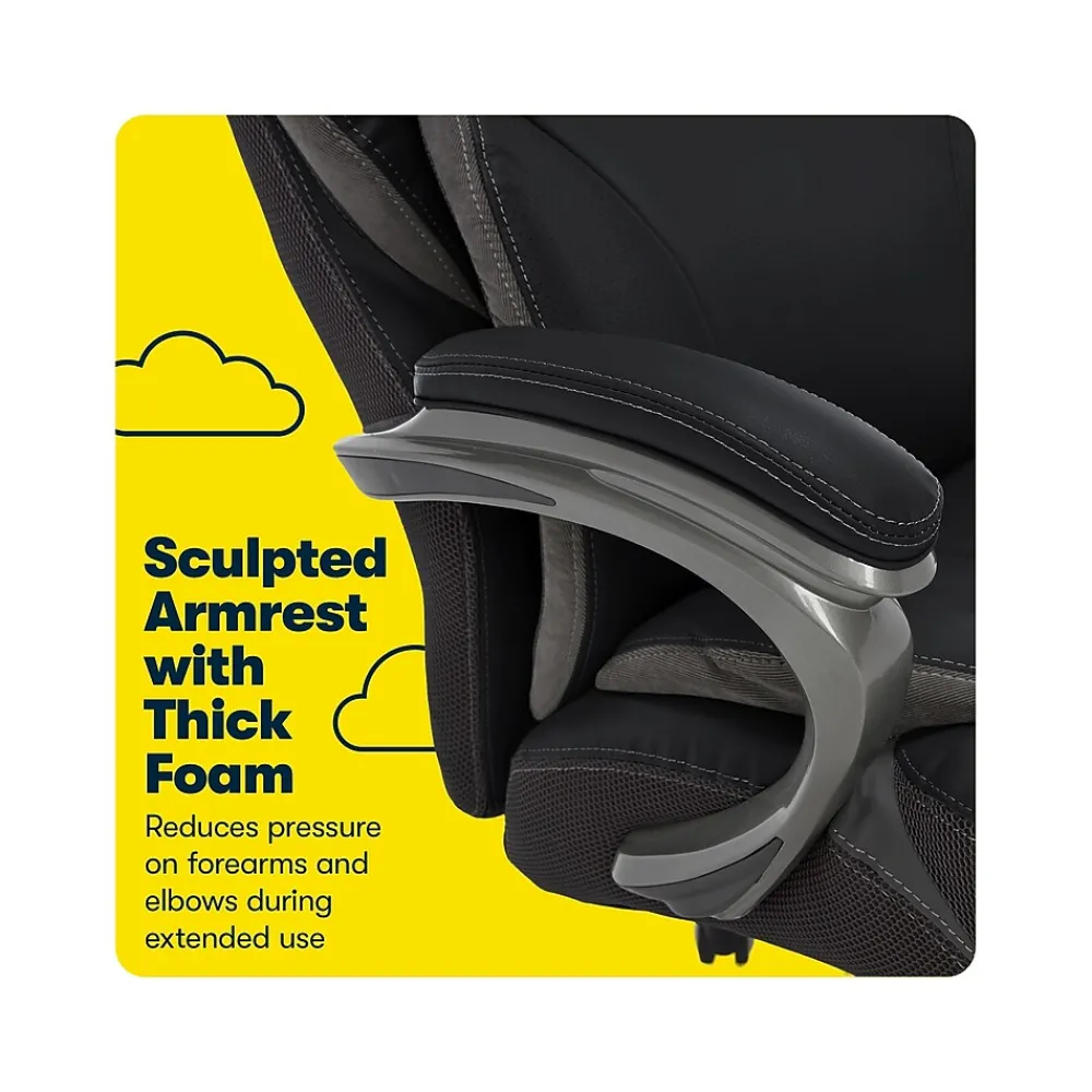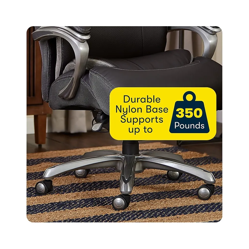 The Serta Big & Tall executive office chair with AIR technology brings you the quality, comfort, and style you expect from a fine office chair. The innovative Serta Premium Elite five-layer cushioning system is strategically placed over individual pocketed ComfortCoils, providing adaptive comfort where you need it most. Designed to transform the way you work, this ergonomic office chair features an AIR lumbar zone that pivots and flexes, following your movements to provide you with superior back support that improves your posture. The easy-access adjustment controls let you customize your position, giving you a personalized seating experience that alleviates discomfort and minimizes stress. This office chair accommodates up to 350 lbs. and has a generous, roomy seating area, so you can stay focused and productive without feeling constricted. With commercial-grade components like an extra-large steel plate and thicker plywood, this executive chair is constructed to be durable and long-lasting. The perfect complement to your professional decor, this Serta Big & Tall office chair has hand-sculpted upholstered arms and smooth bonded leather that delivers elegant style.