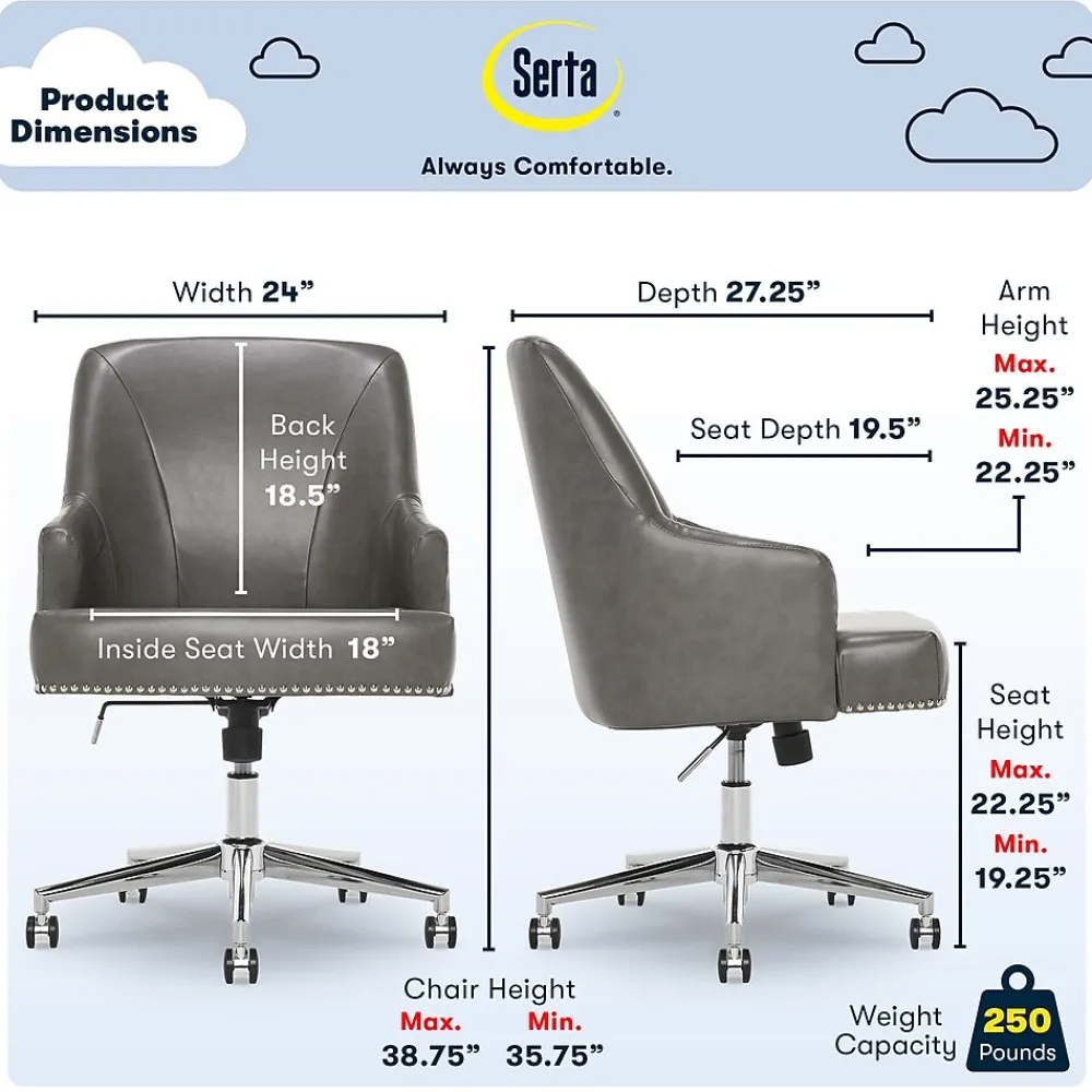 Office workspace, meet Leighton: A classic design, built for comfort. Sink into the soft memory foam cushions and you’ll never go back to an ordinary office chair again. If you’re always on the move, the durable rolling casters are suited for any floor type. A combination of timeless lines and crisp chrome detailing, the Serta Style Leighton Home Office Chair is a chic office essential!