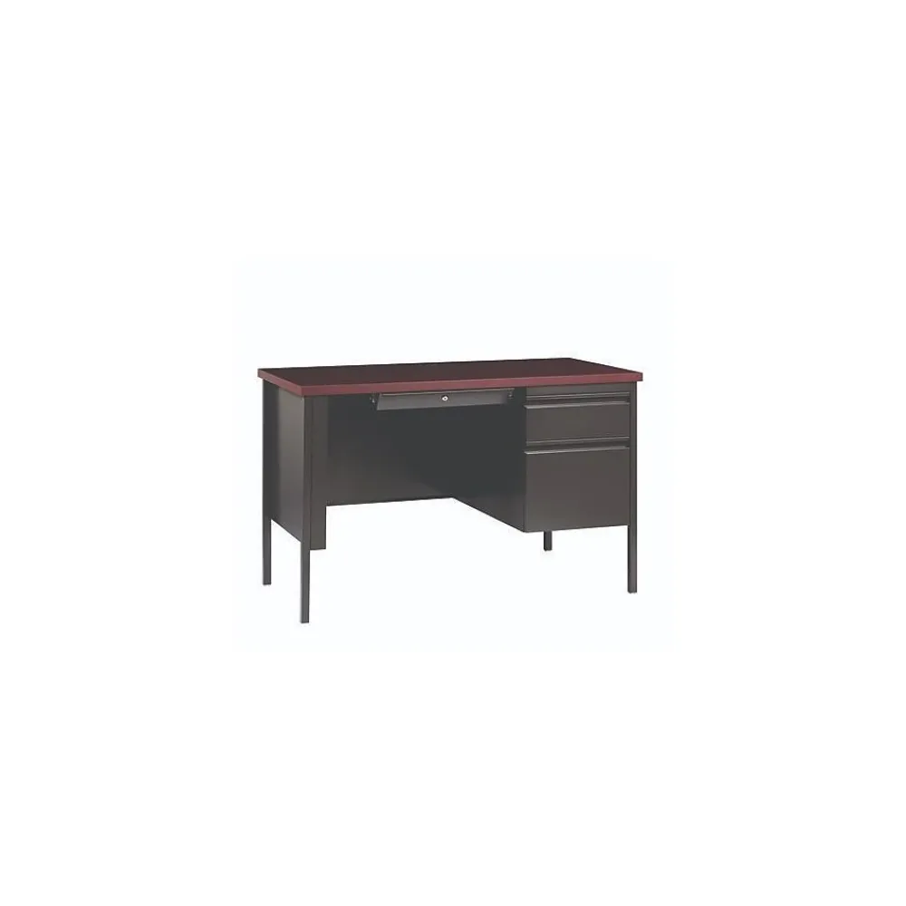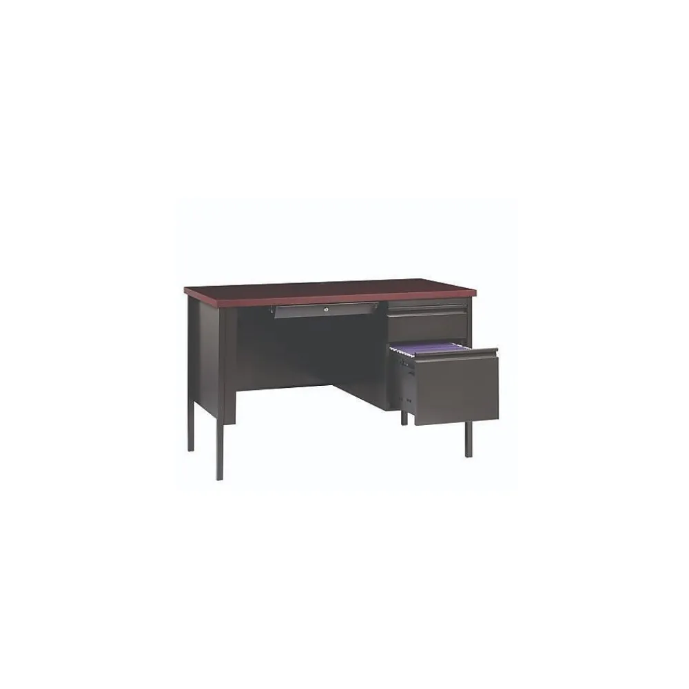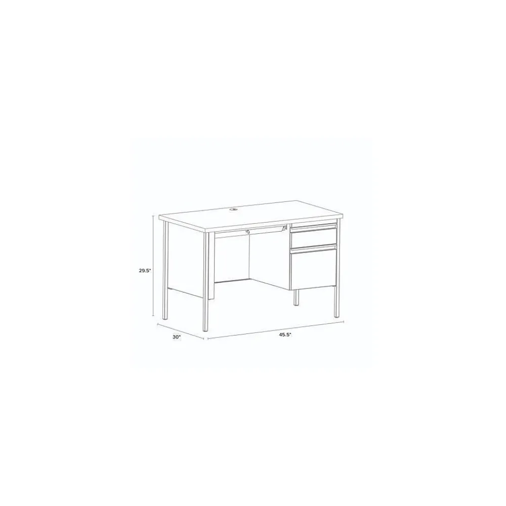 Built with a durable, powder-coated steel frame with 1″ square tubular steel legs. Standard features include full extension ball-bearing drawer slides for smooth drawer action, central locking center drawer, and a strong laminate wood top. Desks ship fully assembled except for the legs. All necessary hardware to attach the legs is included. Designed to meet or exceed ANSI-BIFMA industry standards for performance and workmanship.