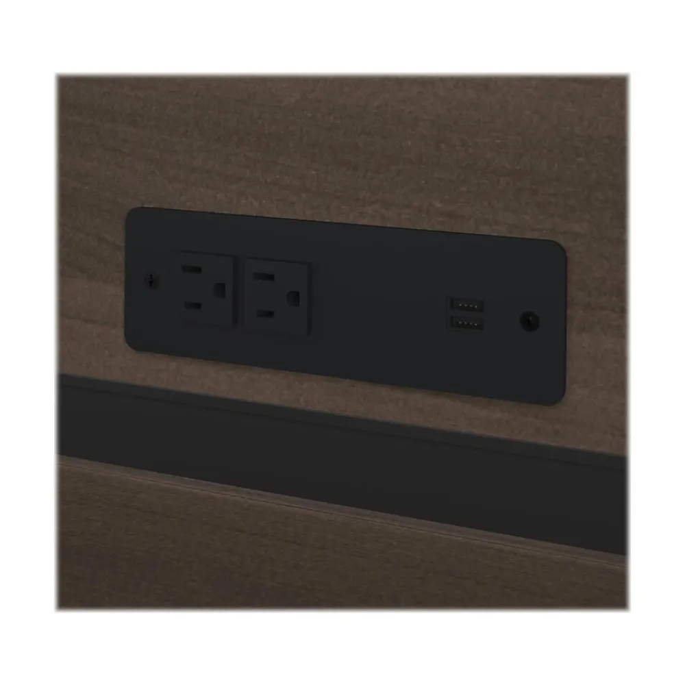 - Hutch has one closed and two open storage areas to store office supplies, one power bar with two power outlets and two USB ports to charge electronics, and a rubber wire management strip is included to hide cables and wires