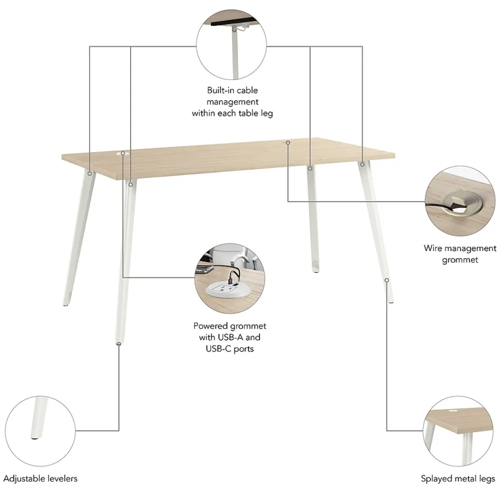 - Splayed metal legs offer a sleek look with built-in cable management, allowing cords to route through any leg to the floor for a clutter-free space