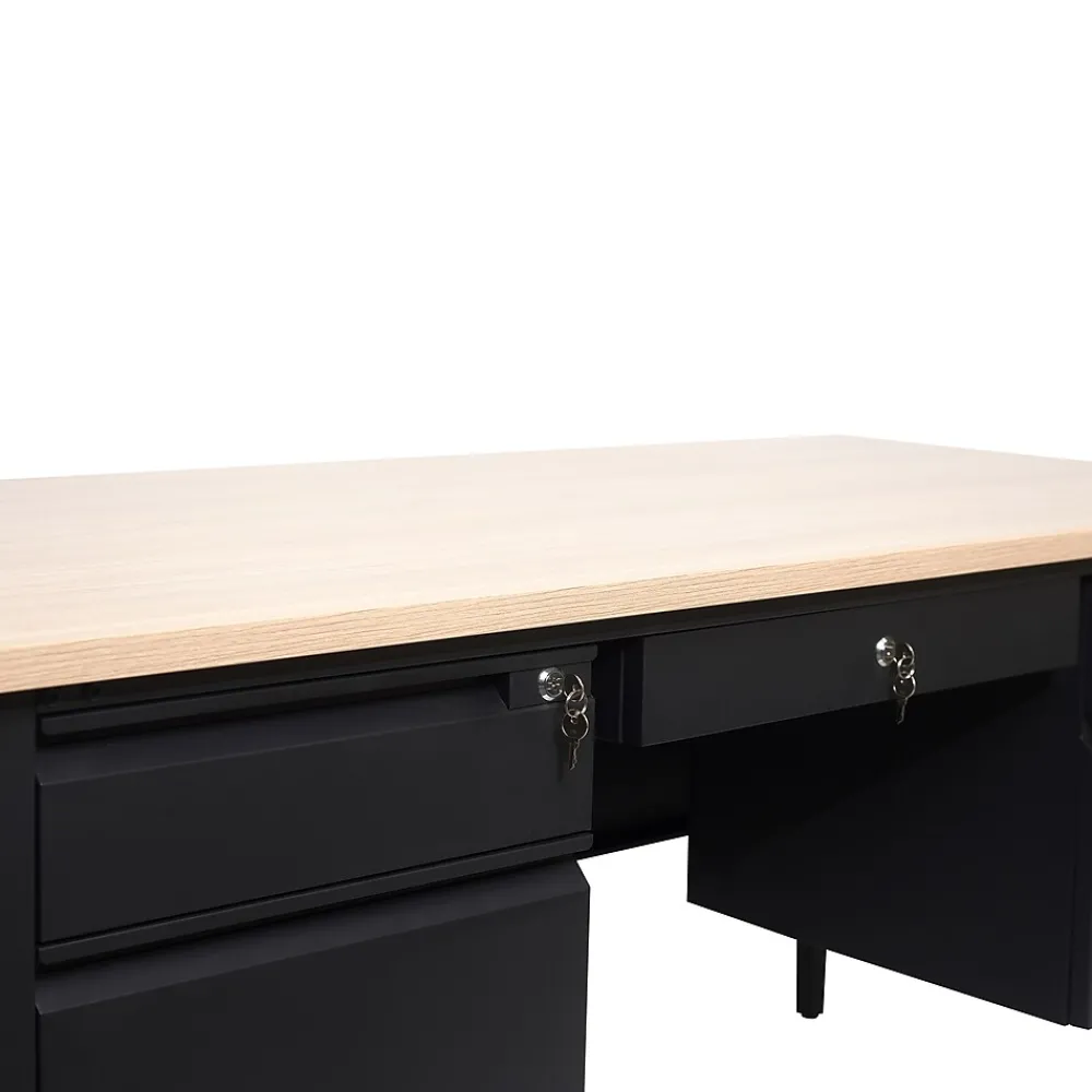 Give teachers and office workers alike a dedicated space for their tasks that is both functional and professional with this commercial grade double pedestal desk. Featuring a 1″ thick long-lasting laminate top, steel frame, and 5 locking drawers with ball bearing drawer slides, this multipurpose desk will stand up to the rigors of daily use. The premium materials allow this metal and wood desk to hold up to 300 lbs. static weight while the self-leveling floor glides ensure a level work surface. Assembly takes 30 minutes or less and a damp cloth is all that is needed to maintain the appearance of this must-have work space.