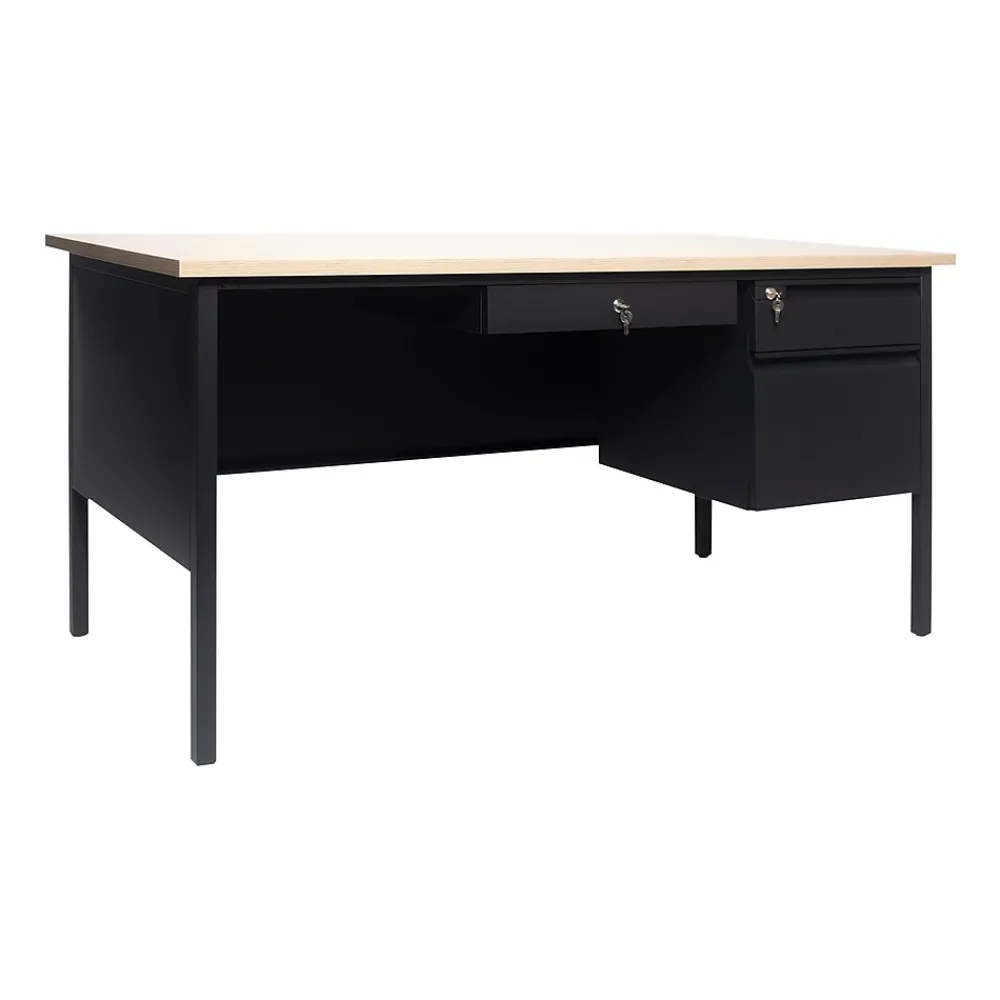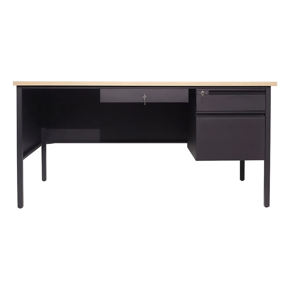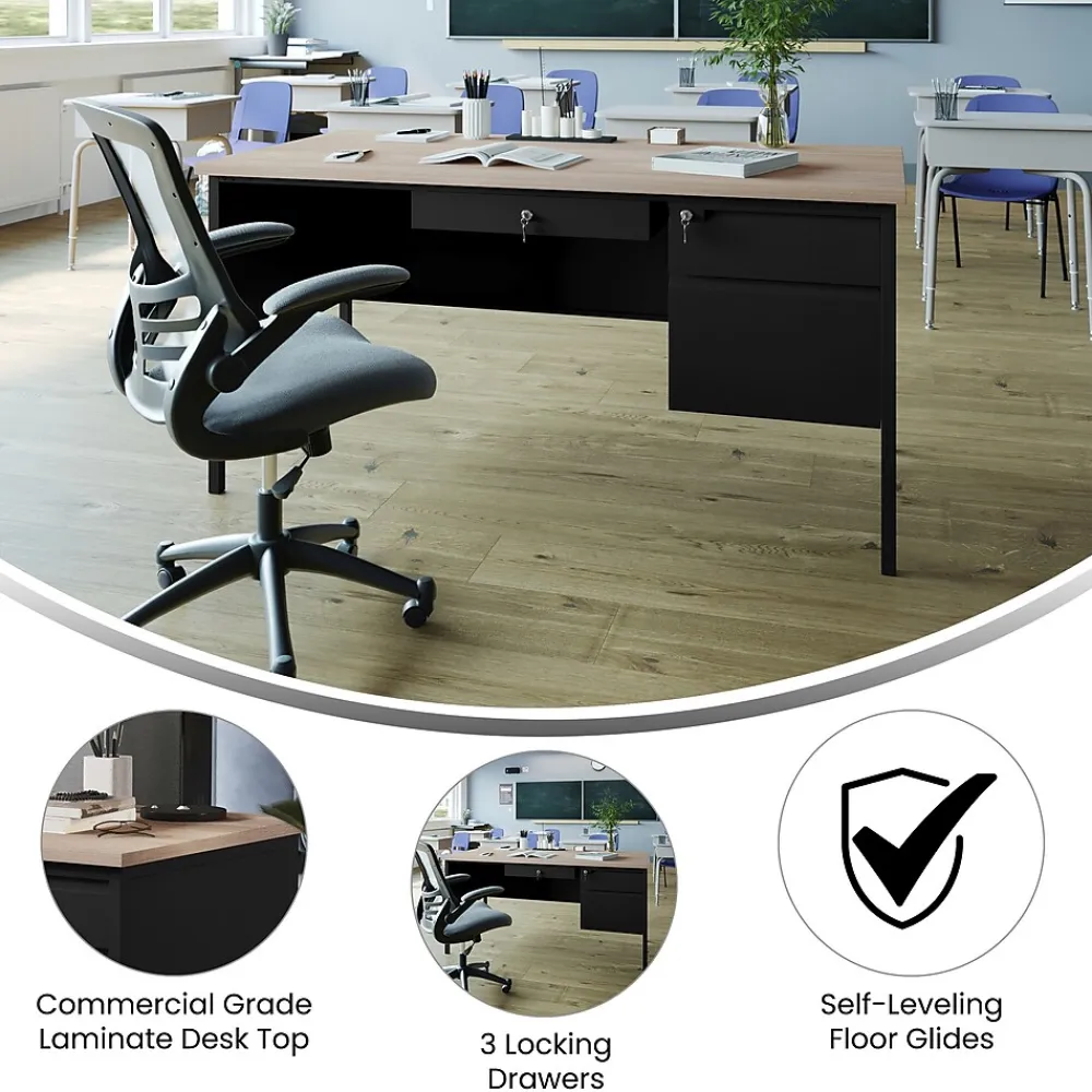 Give teachers and office workers alike a dedicated space for their tasks that is both functional and professional with this commercial grade right side single pedestal desk. Featuring a 1″ thick long-lasting laminate top, steel frame, and 3 locking drawers with ball bearing drawer slides, this multipurpose desk will stand up to the rigors of daily use. The premium materials allow this metal and wood desk to hold up to 300 lbs. static weight while the self-leveling floor glides ensure a level work surface. Assembly takes 30 minutes or less and a damp cloth is all that is needed to maintain the appearance of this must-have work space.