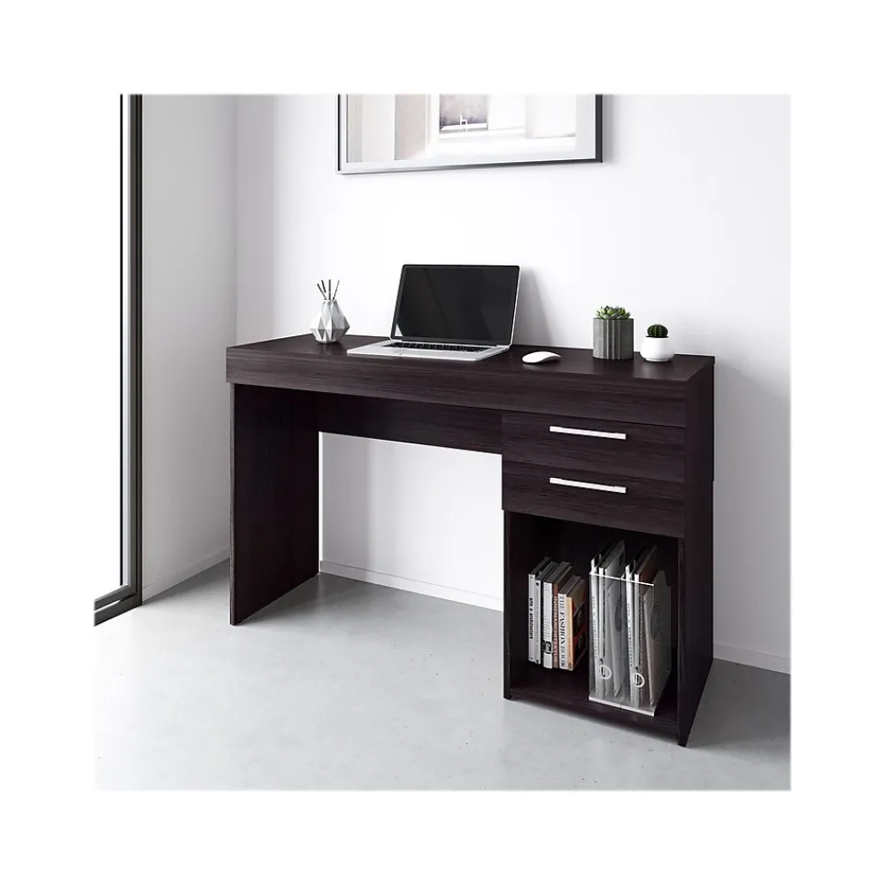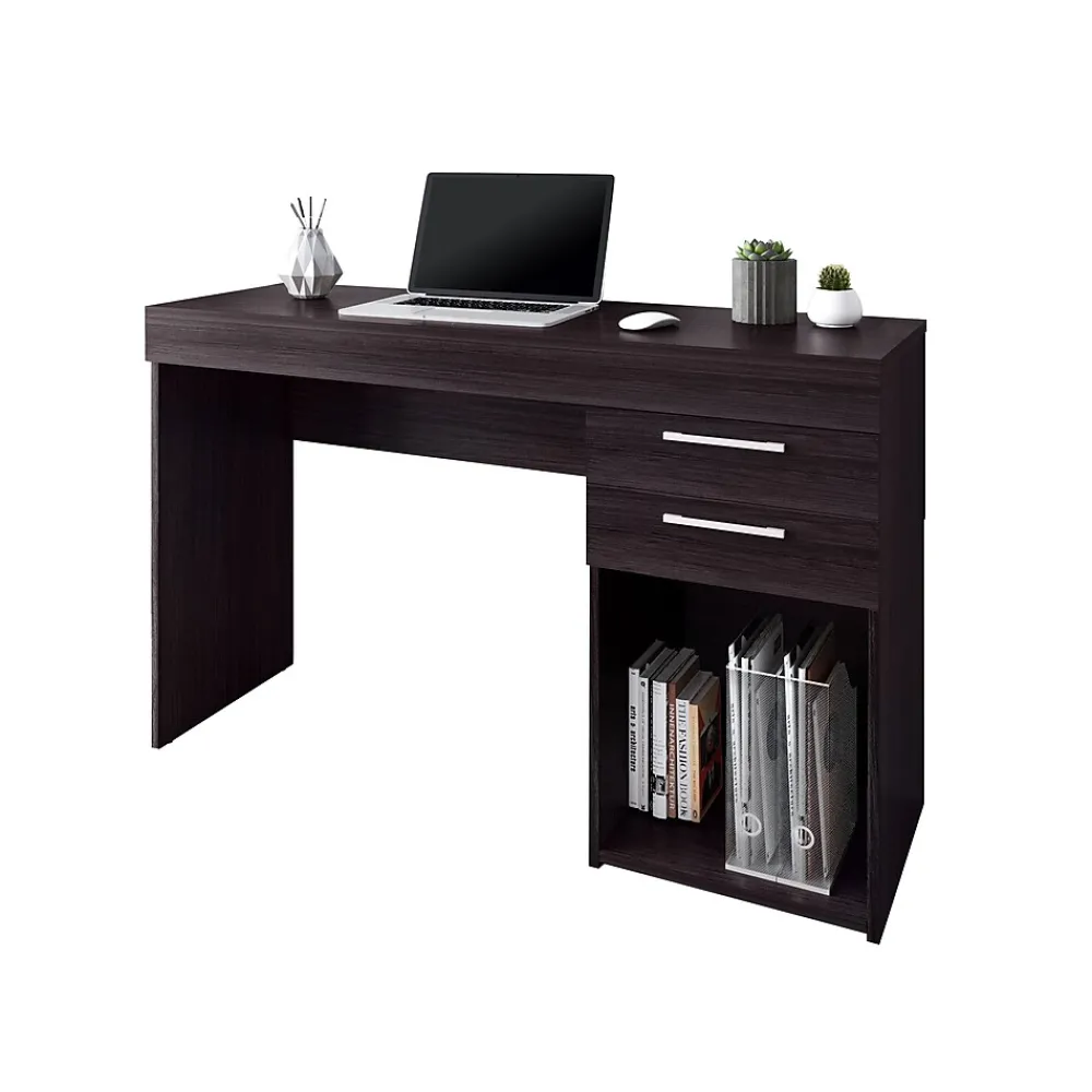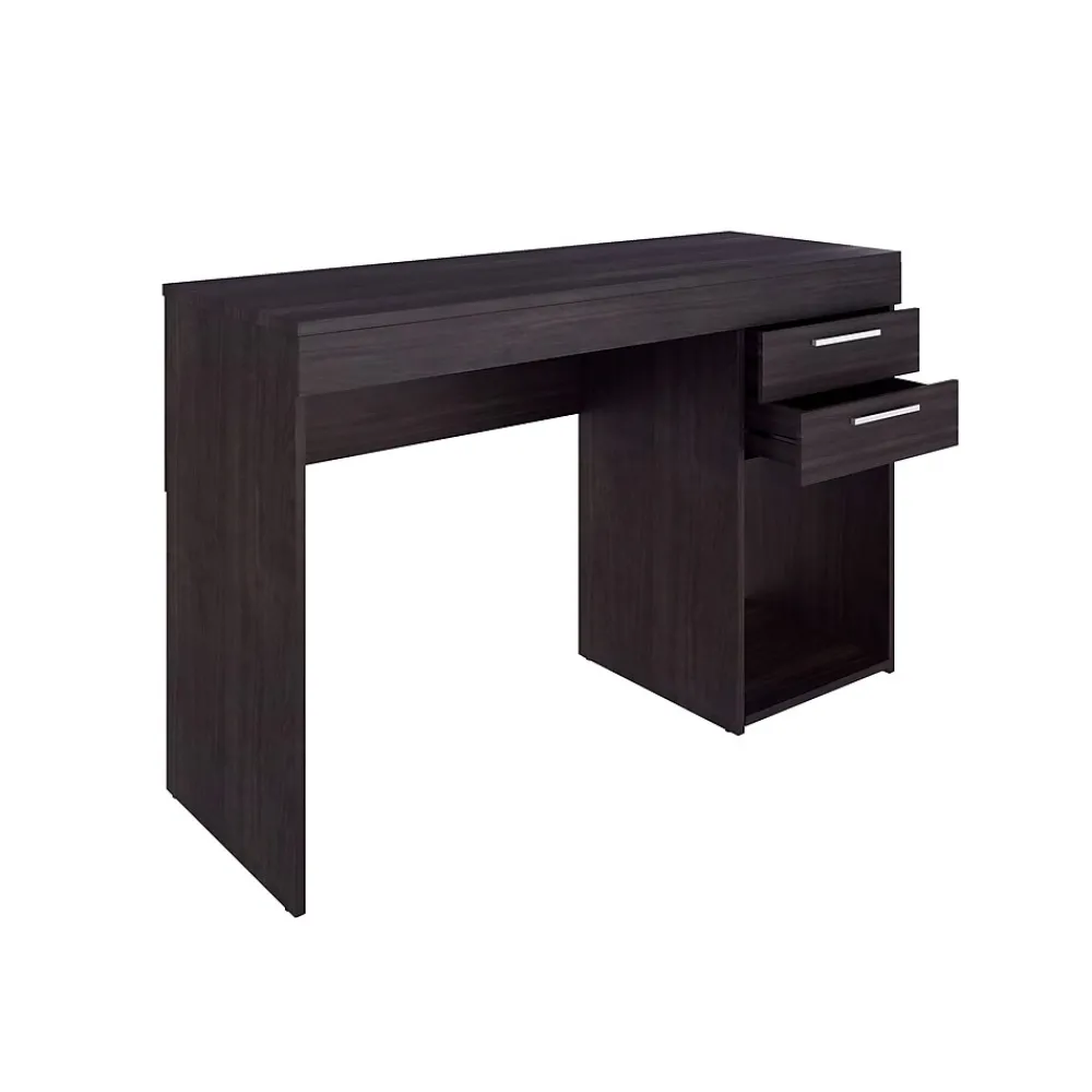 This contemporary workstation desk brings a touch of sophistication to your workspace. Its design is perfect for home offices, offering a generously extended work surface with ample storage. Crafted from durable particleboard with a painted surface, this classic desk with modern appeal makes a statement to any decor. The two pullout drawers keep office essentials within reach while the open shelf at the bottom aids in keeping clutter under control.