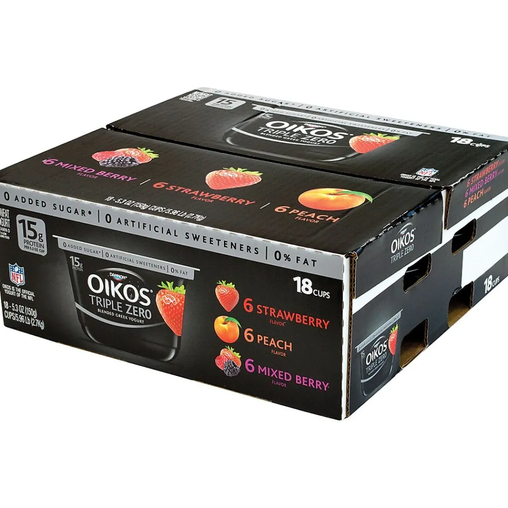 - An 18-Pack of 5.3-Ounce Dannon Oikos Triple Zero Blended Greek Non-Fat Yogurt Cups in a variety of 3 flavors